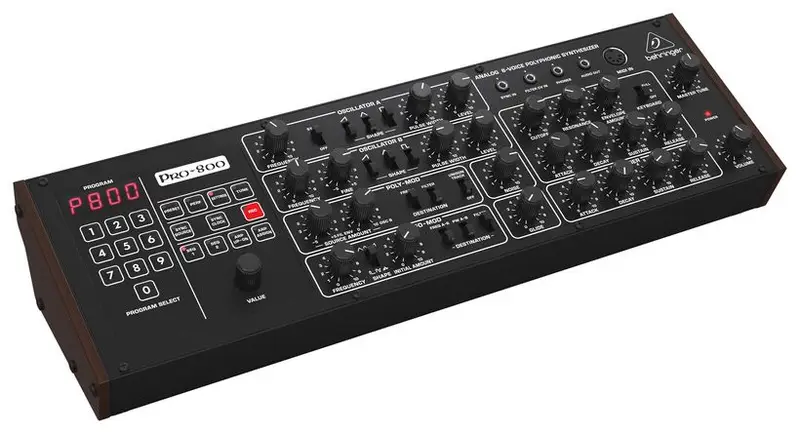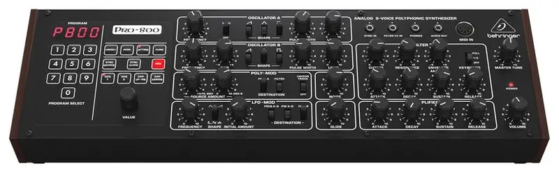 - Behringer Pro-800 – современная 8-голосная аналоговая реплика классического синтезатора Sequential Circuits Prophet-600. Каждый из 8 голосов синтезатора оснащён двумя VCO с тремя формами волны, которые могут быть смешаны между собой: треугольная, пила, пульс с контролем ширины. Есть генератор шума и режим унисона, позволяющий использовать сразу все осцилляторы для синтеза богатых на гармоники тембров.