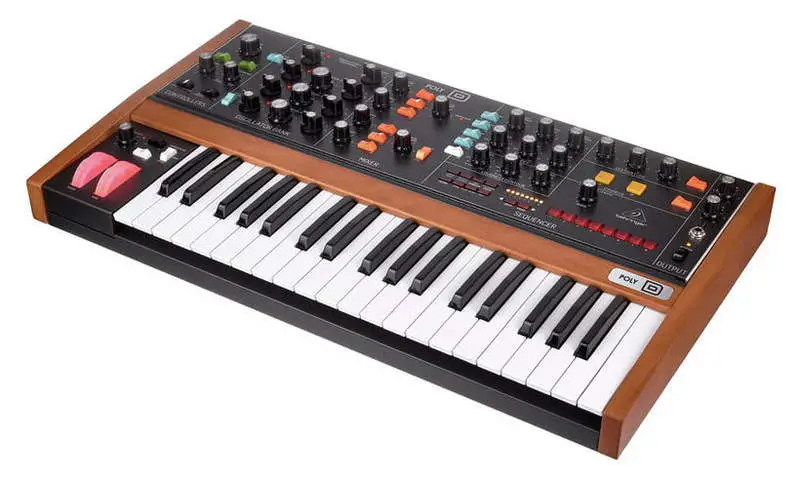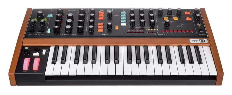 Behringer Poly D. Полифонический четырехголосный аналоговый синтезатор с четырьмя осцилляторами. Подойдет тем, кто хочет представить, как бы мог звучать полифонический Minimoog. Схема сигнального тракта и внешний вид явно отсылают к Minimoog Model D. Poly D оснащен лестничным фильтром, отдельным LFO, секциями дисторшна и хоруса, встроенным секвенсором, и работает в режимах Mono и Unison.