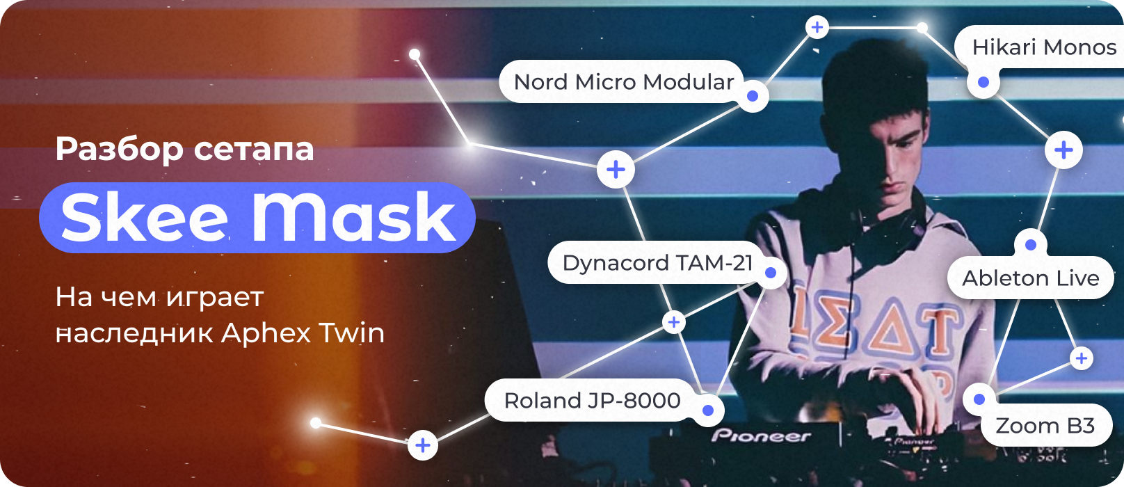Отдельное место в его арсенале занимает Nord Micro Modular — шведский универсал, который позволяет собирать собственные патчи с нуля, и открытый к тысячам схем, созданных другими пользователями еще в начале 2000-х. Он умеет всё: от сложных эффектов до психоакустических манипуляций с внешним звуком. Ski Mask использует его не как синтезатор, а как центр обработки внешних источников звука.
