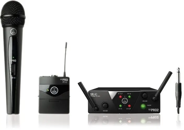 Современная вокальная готовая радиосистема akg включает стандартный набор устройств: миниприемник, поясной передатчик, инструментальный кабель, универсальный блок питания.