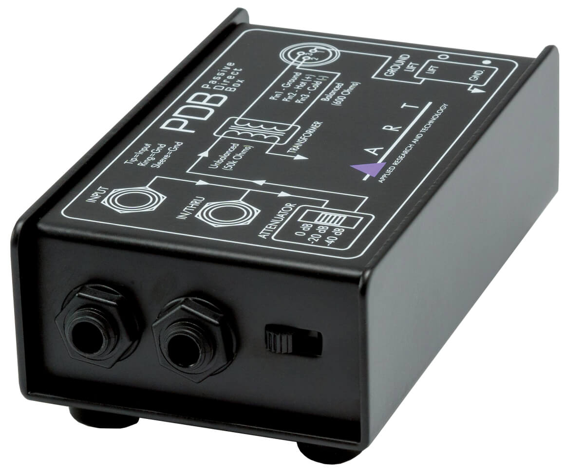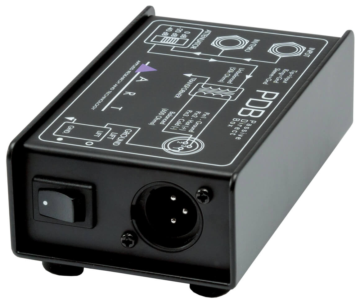 ART PDB — пассивный DI-бокс, предназначенный для подключения небалансных инструментальных, линейных или усиленных сигналов к балансным входам микшеров, предусилителей и аудиоинтерфейсов. Сигнал с входного разъёма направляется на трансформаторно-изолированный XLR-выход и параллельный выход Thru, что позволяет одновременно подавать его на сценический усилитель. Переключаемый аттенюатор обеспечивает ослабление сигнала на −20 или −40 дБ, а функция Ground Lift помогает устранить петли заземления и фоновый гул. Благодаря полностью пассивной конструкции, PDB не требует питания и подходит для работы с активными источниками — синтезаторами, бас-гитарами и гитарами с активным предусилителем. Прочный стальной корпус гарантирует надёжность при использовании на сцене и в туровых условиях.