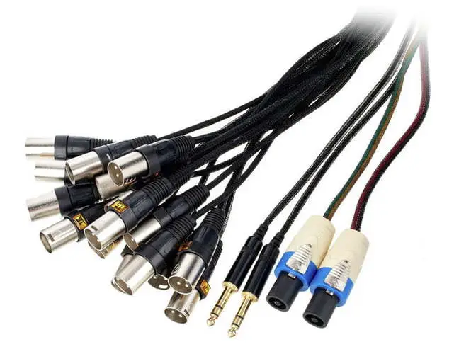 Сценические мультикоры обычно содержат соединительный, микрофонный и кабель под громкоговорители. Подобные модели применяются для получения двусторонней связи между удаленно находящимся пультом звукорежиссера и самой сценой. На одном конце предусмотрено множество различных разъемов, а на другом, ведущем к сцене, – соединительная панель с гнездами. Студийные многоканальные кабели выполняют функцию коммутации инсталляций с музыкальным оборудованием и содержат оптимальные наборы разъемов.