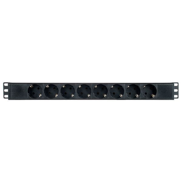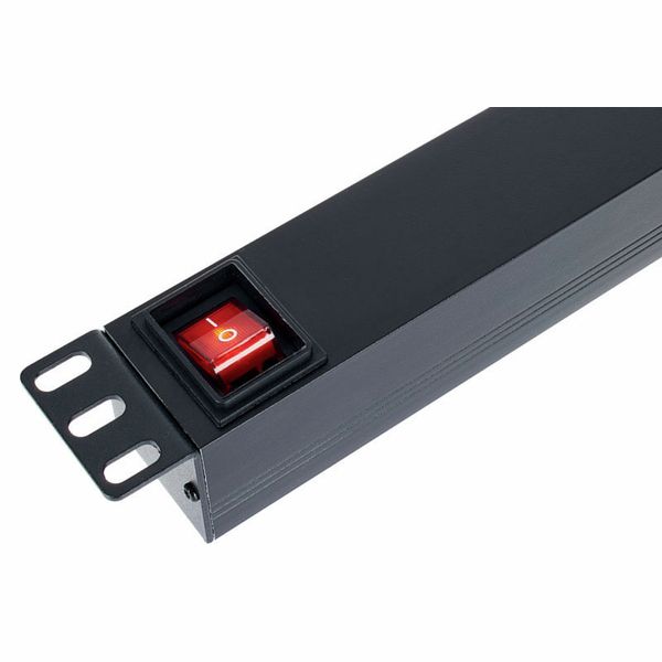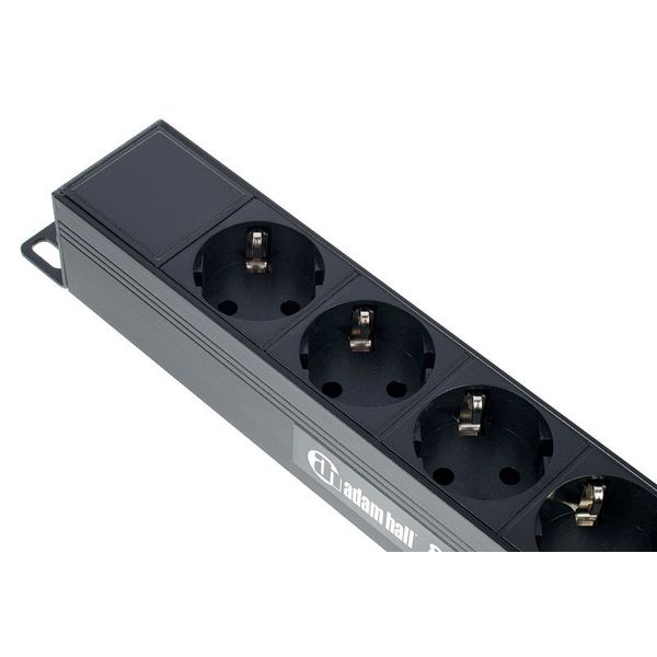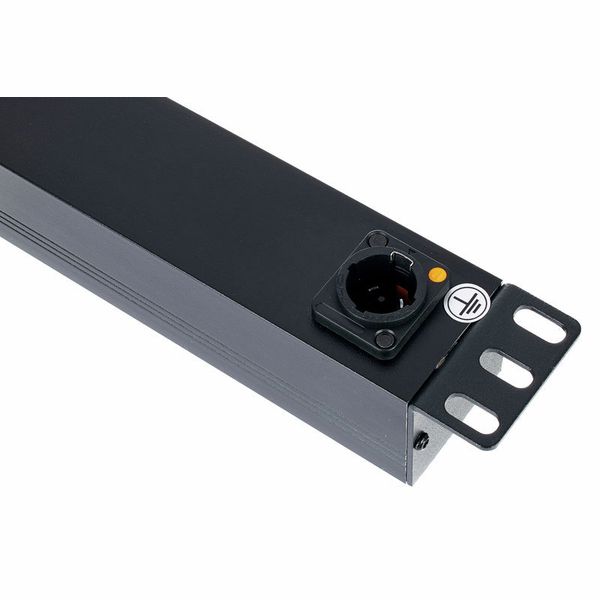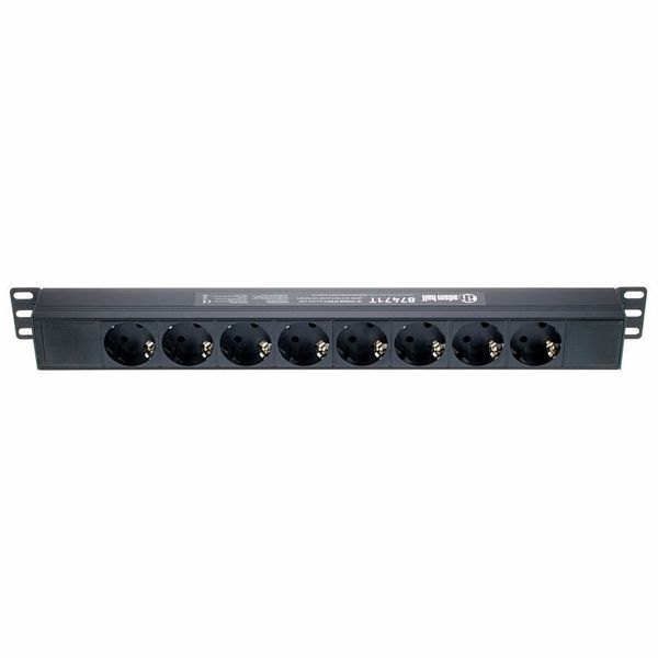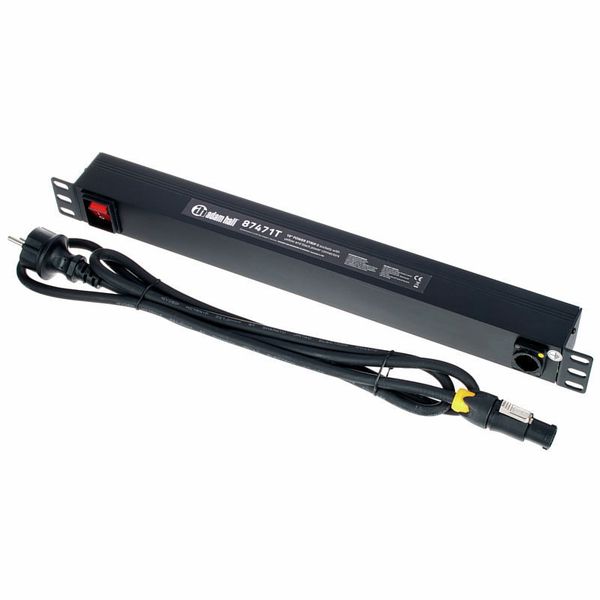 Adam Hall 87471 T — удлинитель формата 19″ (1 U) с восемью заземлёнными Schuko-розетками, расположенными под углом 45° на задней панели. На передней панели установлены гнездо Power‑Twist (TR1) чёрно‑жёлтого цвета и подсвеченный выключатель. Поставляется с 2‑метровым съёмным кабелем H07RN‑F 3 х 1,5 мм² и прямой евровилкой CEE 7/7, пригодной для IP44. Корпус изготовлен из прочного алюминия, окрашен в чёрный цвет. Предназначен для монтажа в стойки, обеспечивает нагрузку до 16 A при 250 V, надёжное распределение питания для звуковой и AV‑аппаратуры.