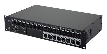 Коммутационный блок Soundcraft VI CSB 16 RJ 45 подключается к микшерному пульту через сетевой кабель Cat5 по интерфейсу MADI. Устройство поставляется с двумя источниками питания, вентилятором охлаждения с термостатическим управлением и полной контрольной индикацией на светодиодах. Также предусмотрен 8-канальный интерфейс GPIO.