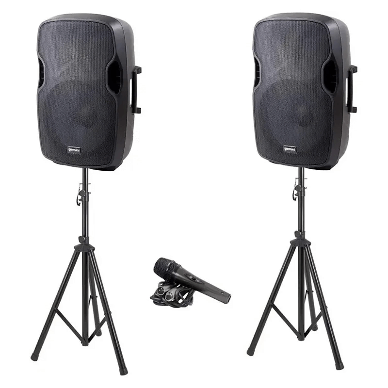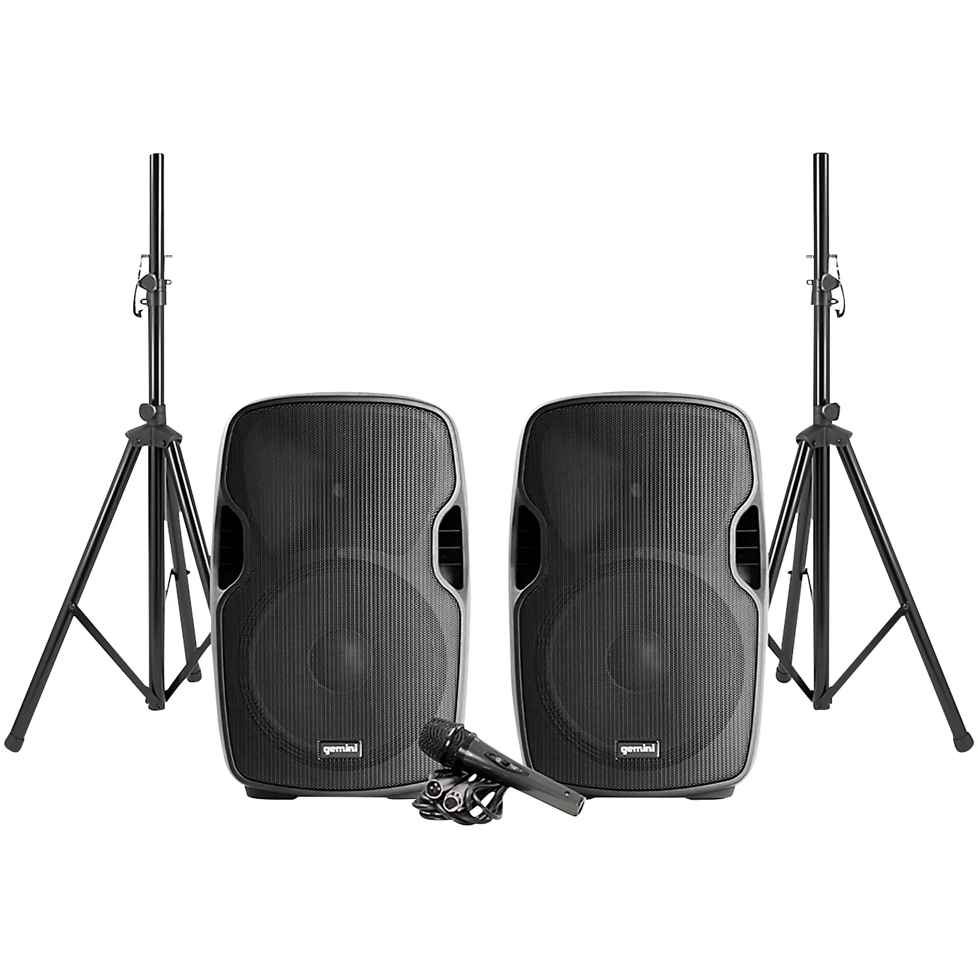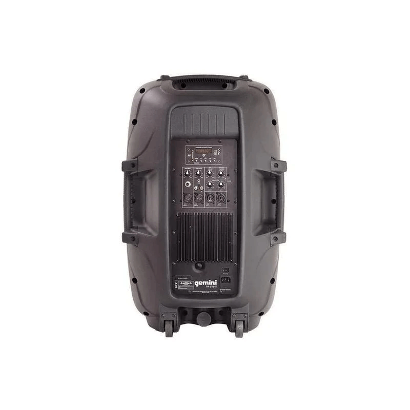 Gemini PA-SYS15 — комплект звукового оборудования, включающий пару колонок, складные стойки и микрофон с кабелем. Комплект создан для озвучивание мероприятий. Активная колонка имеет 15-дюймовый низкочастотный динамик и дополнительный пассивный динамик того же размера, что позволяет достичь пиковую мощность 2000 Вт. Встроенный проигрыватель поддерживает Bluetooth и воспроизведение с USB-накопителей, SD-карт. Также есть FM-радио. Для удобства перемещения в корпус встроены колеса, выдвижная ручка-тележка и эргономичные ручки для переноски. Поставляемые регулируемые по высоте стойки из нержавеющей стали выдерживают вес до 90 кг, имеют диаметр 38 мм, легко собираются и раскладываются, обеспечивая оптимальное распределение звука по помещению.