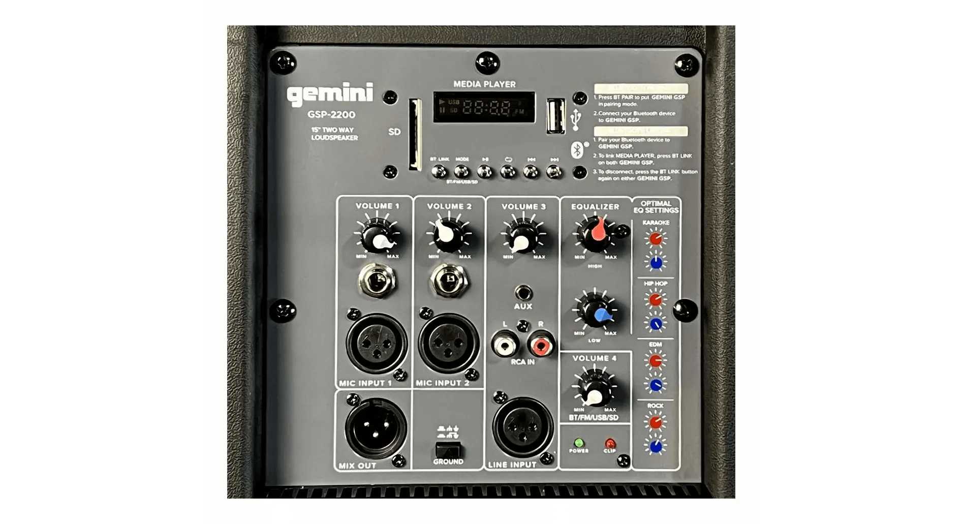 Gemini GSP-2200 — активная акустическая система. Оснащена 15-дюймовым низкочастотным динамиком и 3,5-дюймовым рупорным твитером. Модель поддерживает потоковую передачу звука по Bluetooth и может работать в парах по технологии TWS. Есть встроенный медиаплеер, способный читать аудио с USB-накопителей и SD-карт, а также FM-радио. На задней панели расположен 4-канальный микшер: два монофонических канала с отдельными входами XLR и Jack TS для подключения микрофонов, линейный стерео канал с входами mini-jack TRS и RCA, а также канал для встроенного медиаплеера, управляемый отдельной ручкой громкости. Для коррекции звучания есть 2-полосный эквалайзер. GSP-2200 обладает световым индикатором перегрузки для контроля уровня сигнала. Для транспортировки предусмотрены удобная выдвижная ручка с колесиками и прочные боковые рукоятки. Модель допускает установку на 35-мм стойку.