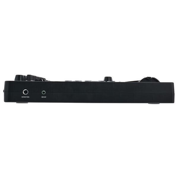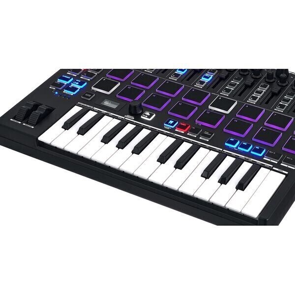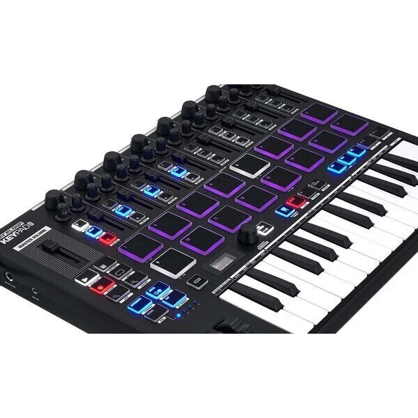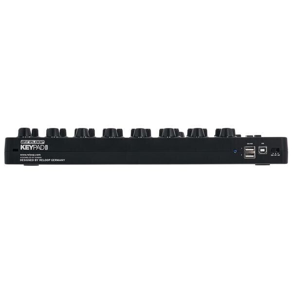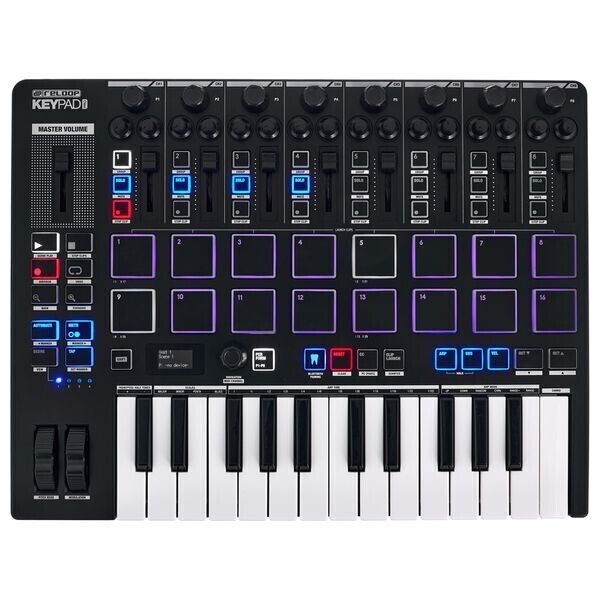 Reloop Keypad Pro — DAW-контроллер для продюсирования и живых выступлений. Оснащён встроенной клавиатурой с 25 полноразмерными velocity-чувствительными клавишами, поддержкой pitch bend и modulation wheels. Встроенный арпеджиатор с набором паттернов, режим аккордов и функция Scale Mode обеспечивают быстрый доступ к гармонически правильной игре. 16 динамических RGB-пэдов с aftertouch используются для создания ритмов, запуска клипов и управления параметрами эффектов. Центральная секция управления включает 8 полноценных каналов с фейдерами, энкодерами (панорама), потенциометрами (send/return) и функциональными кнопками (Channel, Solo, Rec), а также транспортный блок (Play, Stop, Rec, Loop, Automate, Metronome). Контроллер поддерживает проводное подключение (USB, MIDI Out) и беспроводное соединение по Bluetooth, питание может осуществляться как от USB, так и от батарей, что делает устройство удобным для мобильных сетапов. Встроенный пассивный USB-хаб (2x USB-A) позволяет подключать внешние устройства. OLED-дисплей и индикаторы сцен обеспечивают наглядную навигацию по параметрам. Комплект поставки включает программное обеспечение: Bitwig Studio 8-Track, Loopcloud Studio (2 месяца), Excite Audio Lifeline Expanse Lite, Melodics (40 уроков) и 3-месячную лицензию Serato Studio.