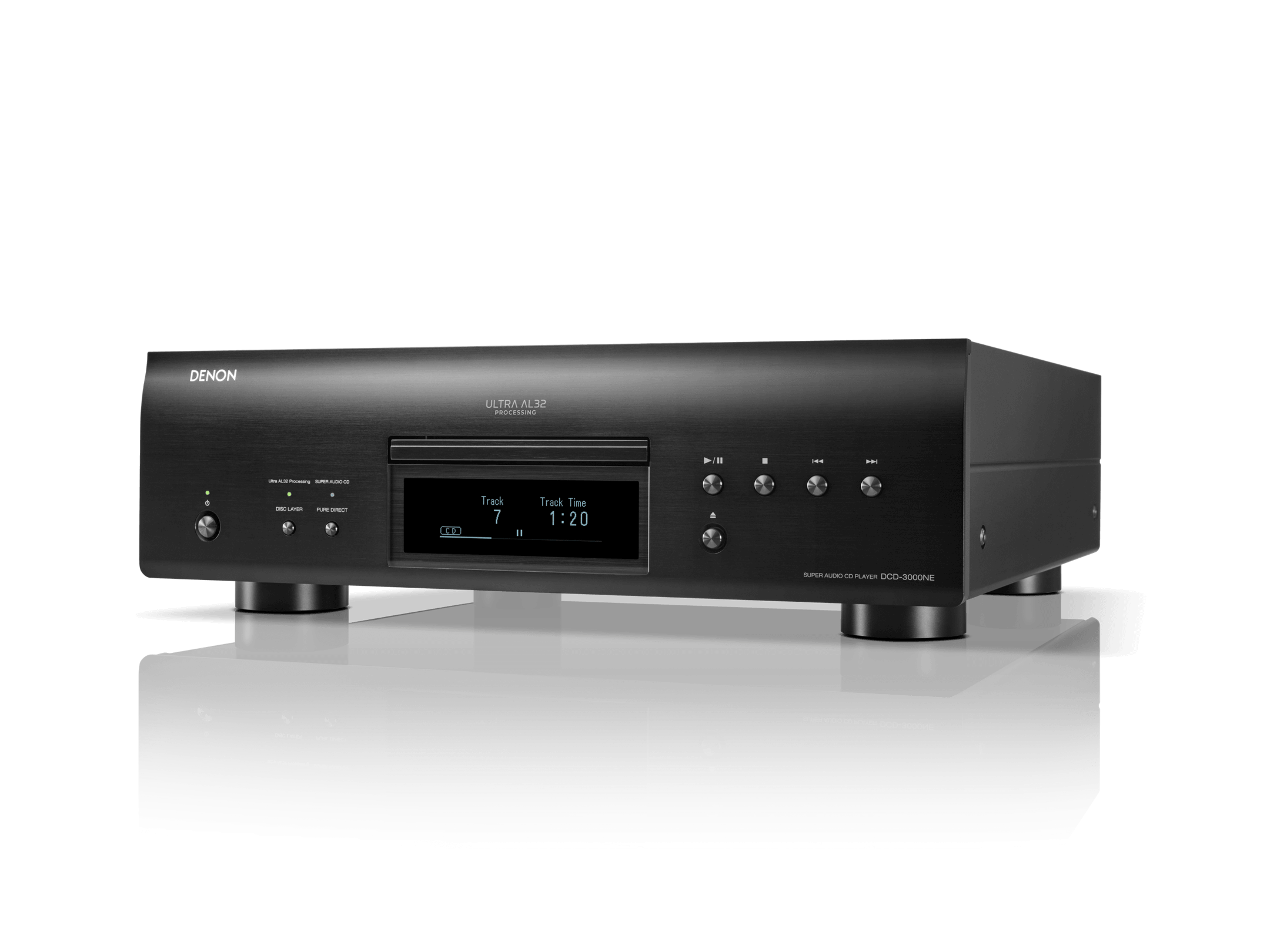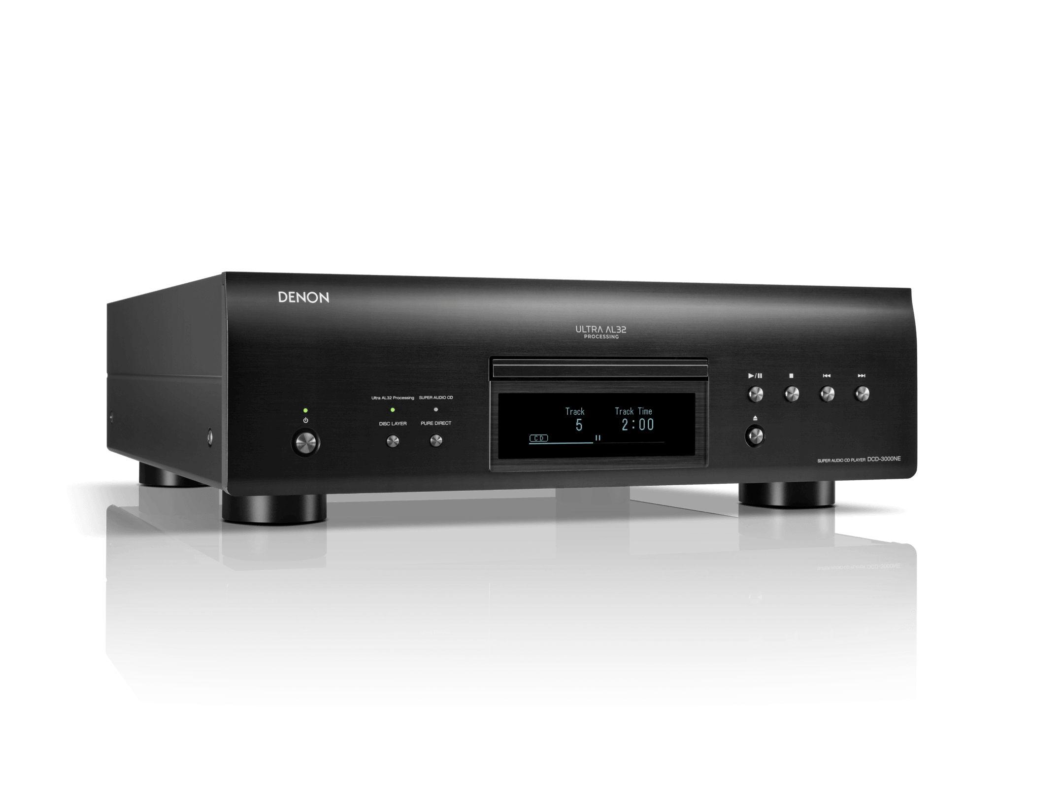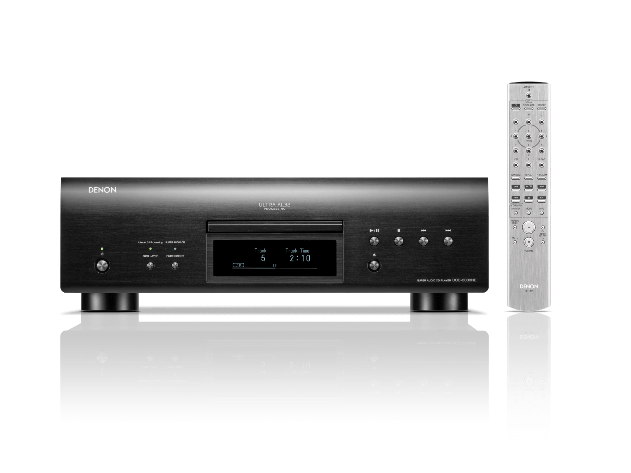 Denon DCD-3000NE Black — SACD/CD-плеер. Оснащен системой из четырех 32-битных/384 кГц цифровых аналоговых преобразователей ESS Sabre ES9018K2M. В устройство интегрирован фирменный цифровой процессор Ultra AL32 Processing, который использует алгоритмы интерполяции и апсемплинга для повышения качества воспроизводимого аудио. Механизм с технологией Suppress Vibration Hybrid (S.V.H.) подает диски быстро и точно, снижая вибрации и обеспечивая стабильность считывания данных. Корпус с алюминиевой передней панелью и усиленным металлическим шасси снижает электромагнитные и механические помехи. Плеер поддерживает воспроизведение широкого спектра форматов, включая SACD (многоканальный и стерео), CD, а также WAV, FLAC, ALAC, AIFF с разрешением до 24 бит/192 кГц и DSD до 5.6 МГц. Тщательно спроектированная цифровая и аналоговая часть с дискретным дифференциальным усилителем, а также master clock минимизирует джиттер, обеспечивая максимально чистое и натуральное звучание. Наличие режима Pure Direct позволяет исключить влияние цифровых цепей, сохраняя максимальную прозрачность звука. Плеер оснащен цифровыми оптическими и коаксиальными выходами, аналоговыми RCA выходами с позолоченными разъемами и удобным управлением с пульта дистанционного управления с алюминиевой лицевой поверхностью.
