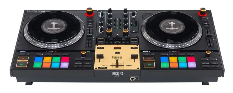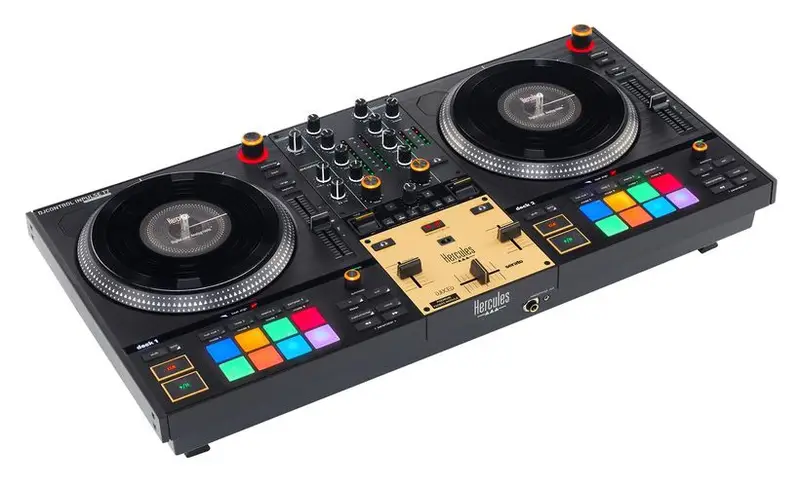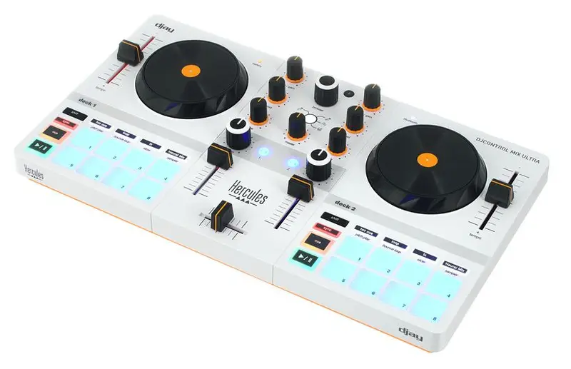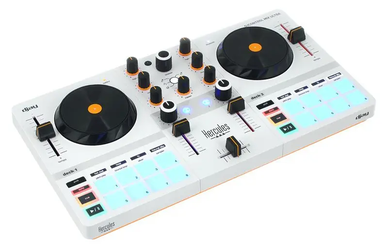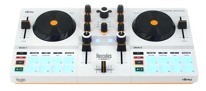Hercules DJControl Mix — портативный DJ-контроллер для смартфона и планшета (Android и iOS) с подключением по Bluetooth и USB. Оснащен основными функциями для обучения микшированию и скретчингу. Работает с прилагаемым программным обеспечением Algoriddim djay.