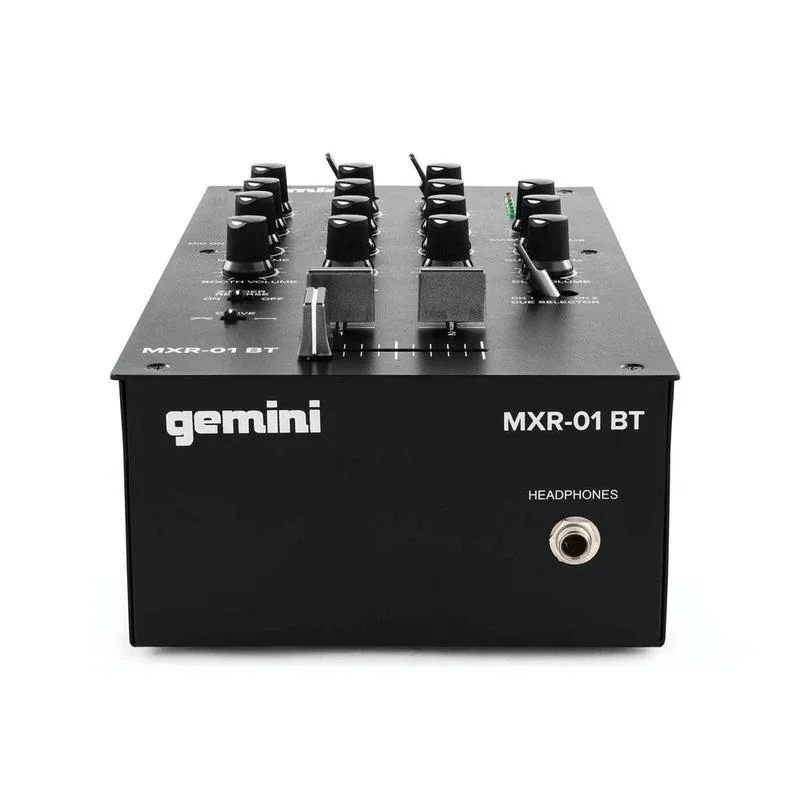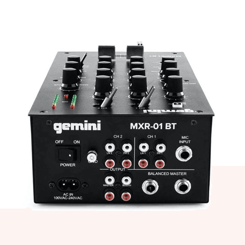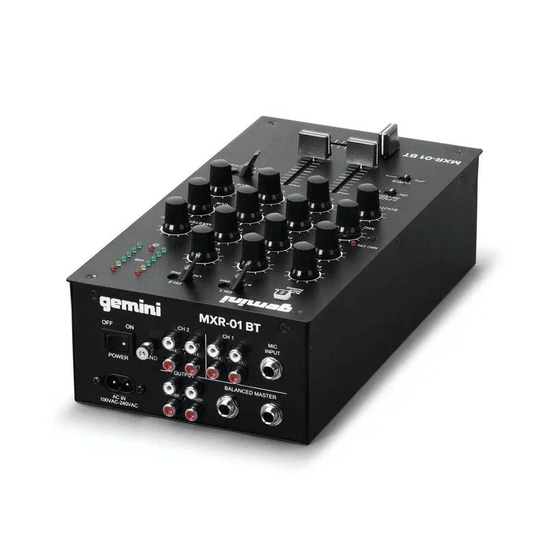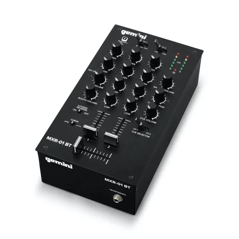 Gemini MXR-01BT — 2-канальный DJ-микшер с прочным цельнометаллическим корпусом. Устройство оснащено двумя входными стереоканалами с возможностью переключения типов входа Phono/Line, что позволяет подключить до 4 стереоисточников (2 Phono и 2 Line) на 8 RCA-разъемах, не считая микрофонного входа и Bluetooth-приемника. Одновременно микшировать с помощью основных канальных фейдеров можно до двух стереоисточников. Каждый канал оборудован отдельным 3-полосным эквалайзером и регулятором усиления (gain). Микшерный пульт также имеет отдельный микрофонный вход 6,3 мм с собственным двухполосным эквалайзером и регулятором громкости. Основной выходной идет через балансные (1/4" Jack TRS) и небалансные (RCA) выходы Master, а для мониторов предусмотрен отдельный Booth выход с независимыми контроллерами громкости и эквалайзера. Кроссфейдер выполнен на базе VCA с регулируемой кривой отклика и имеет функцию реверса для скретчинга. Также кроссфейдер легко заменяем. Встроенный Bluetooth-приемник позволяет подключать внешние устройства для беспроводной передачи аудио, что удобно для фонового воспроизведения или быстрой передачи музыки с мобильных гаджетов. Для контроля звучания доступен LED-индикатор уровня сигнала, переключатель Cue Selector и регулятор Cue/Pgm для мониторинга звука через наушники. Частотный диапазон 20 Гц — 20 кГц.
