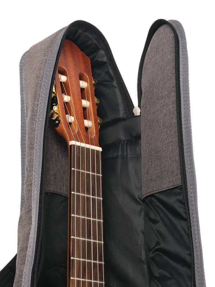 2. С ребрами жесткости и уплотнительными вставками. Этот чехол для классической гитары считается полужестким. По внешнему виду он напоминает классические туристические рюкзаки. В таких аксессуарах присутствуют ребра, прокладки и специальные вставки в местах, где высок риск повреждения изделия.