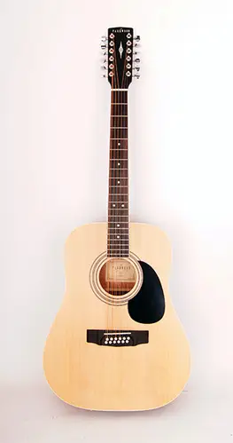 12 струнная акустическая гитара – детище, созданное в начале 20-века американскими гитарными мастерами. Данный инструмент стал своеобразным симбиозом нескольких музыкальных устройств. Он имеет шесть парных рядов струн, которые можно настроить в унисон, а при классическом строе, в октаву.