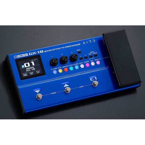 BOSS GX-1B Bass Effects Processor — компактный напольный процессор эффектов для бас-гитары с моделированием усилителей на базе технологии AIRD. Устройство построено на цифровой платформе серии GX и оптимизировано под работу с басовым диапазоном, включая расширенную динамику, устойчивую обработку низких частот и адаптированные алгоритмы усилителей и эффектов. Внутренняя архитектура использует 32-битную обработку с плавающей запятой, 24-битное АЦП и 32-битное ЦАП преобразование при частоте дискретизации 48 кГц, что обеспечивает стабильный уровень сигнала, низкий уровень искажений и корректную работу эффектов при высокой динамической нагрузке. GX-1B поддерживает одновременную работу до восьми эффектных блоков, загрузку пользовательских WAV-импульсных откликов кабинетов и гибкую маршрутизацию сигнала, а также интеграцию в современные сетапы через USB-C и Bluetooth Audio/MIDI. Форм-фактор напольной панели со встроенной педалью экспрессии и автономным питанием ориентирован на мобильное и сценическое использование.