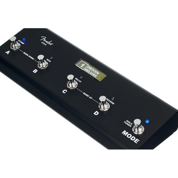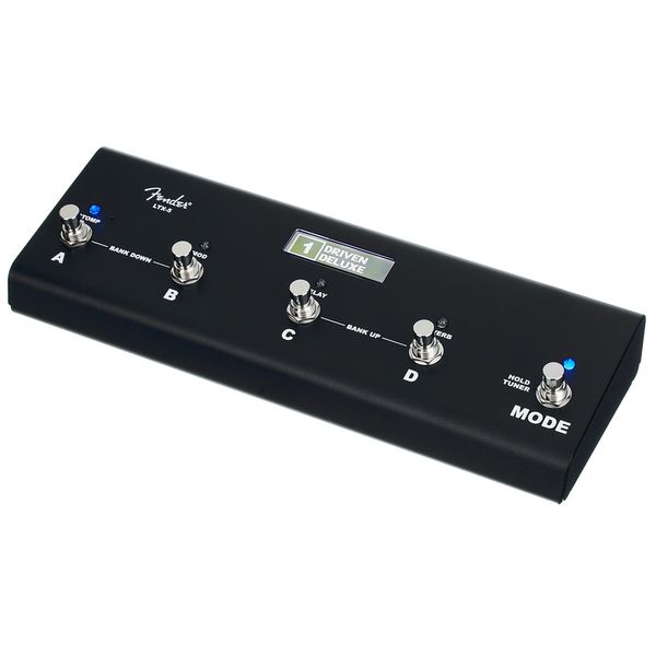 Fender LTX-5 Footswitch — пятикнопочный ножной контроллер, разработанный для гитарных усилителей Fender Mustang LTX 50 и Mustang LTX 100. Педаль обеспечивает управление пресетами, банками и эффектами, без необходимости взаимодействия с панелью усилителя. Конструкция выполнена в прочном алюминиевом корпусе, рассчитанном на интенсивную сценическую эксплуатацию. Архитектура управления включает два основных режима — Preset и Effects с отдельной кнопкой Mode для переключения режимов и активации встроенного хроматического тюнера. В режиме Preset доступна навигация по банкам и прямой вызов пресетов A/B/C/D, а также функция Tap Tempo. В режиме Effects реализовано индивидуальное включение и обход (bypass) блоков Stomp, Modulation, Delay и Reverb. Индикация состояния осуществляется посредством двухцветных светодиодов и LED-дисплея, отображающего информацию тюнера и активных функций. Подключение к усилителю осуществляется через интерфейс RJ-45, в комплект входит соединительный кабель RJ-45 длиной 3,5 м.