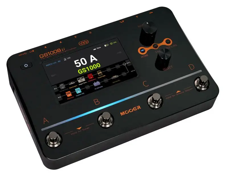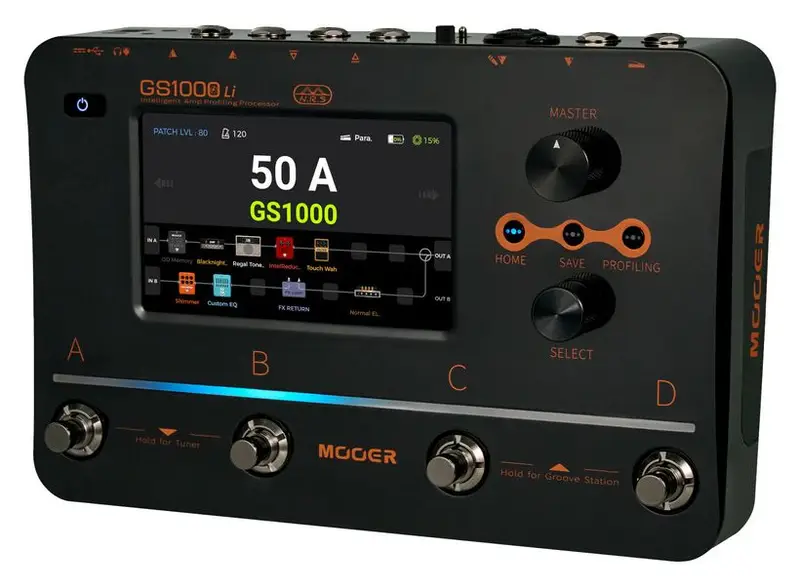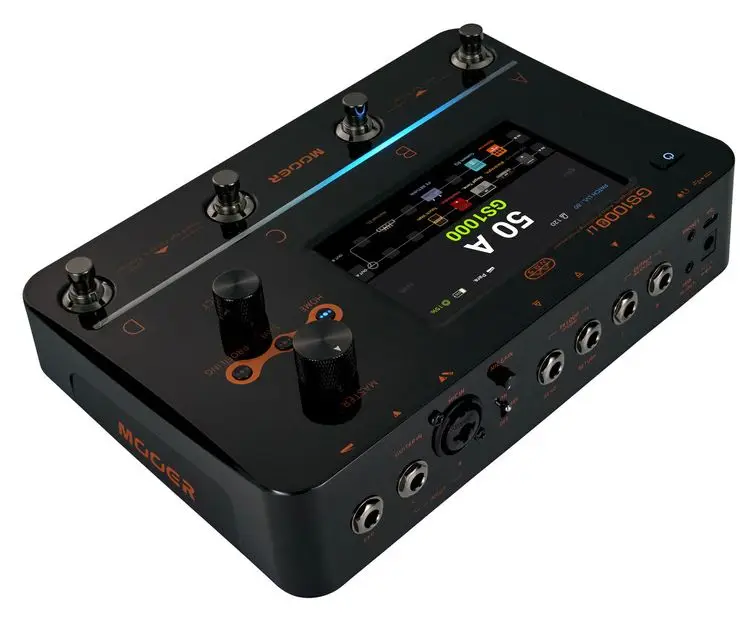 Mooer GS1000 — гитарный процессор профилирования усилителей, использующий технологию MNRS 2.0 для точной эмуляции педалей дисторшн, предусилителей, головок усилителей и кабинетов. Устройство оснащено 5-дюймовым высококачественным сенсорным экраном с интуитивно понятным интерфейсом, обеспечивающим легкую настройку и управление. В арсенале GS1000 более 350 оригинальных заводских моделей эффектов и 120 слотов для сэмплов, которые можно загружать и выгружать через приложение MOOER Cloud. Функция Groove Station включает в себя драм-машину и лупер с синхронизацией, а AI-контролируемый автоматический эквалайзер обеспечивает оптимальное звучание. Профессиональный ASIO USB-аудиоинтерфейс с низкой задержкой поддерживает частоту дискретизации до 192 кГц. Устройство совместимо с MIDI, имеет переключаемую стерео FX-петлю для подключения внешних педалей и поддерживает сторонние IR-файлы кабинетов с разрешением до 2048 точек. Дополнительные функции включают регулируемое фоновое освещение, фантомное питание 48 В и беспроводное подключение по Bluetooth 5.0 для AUX-входа.