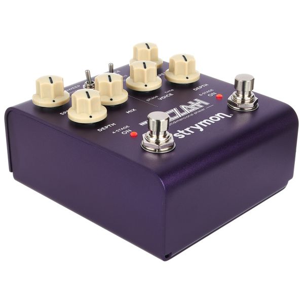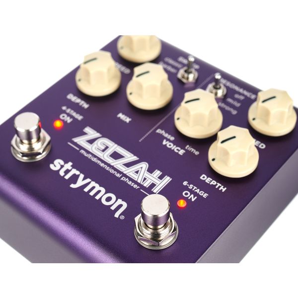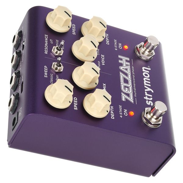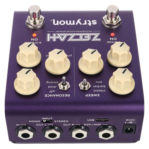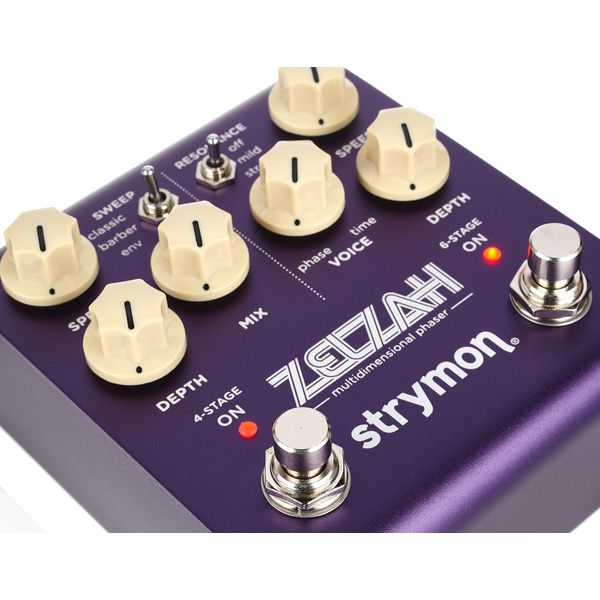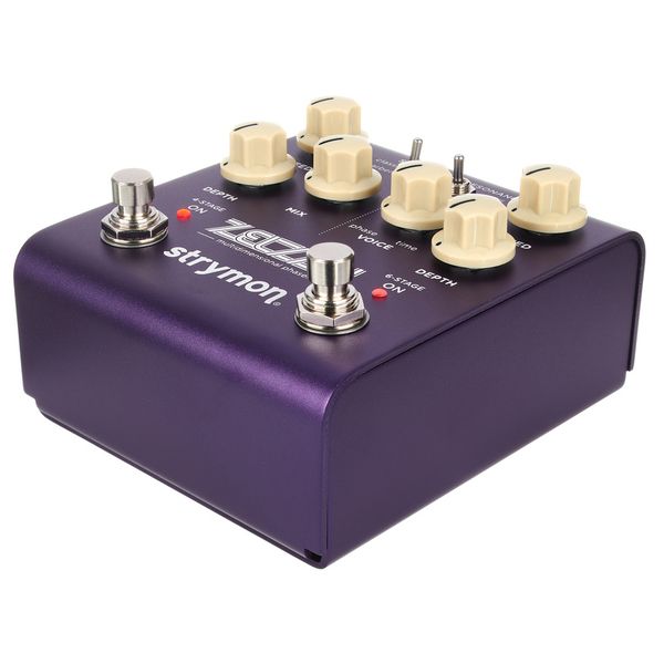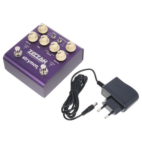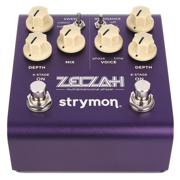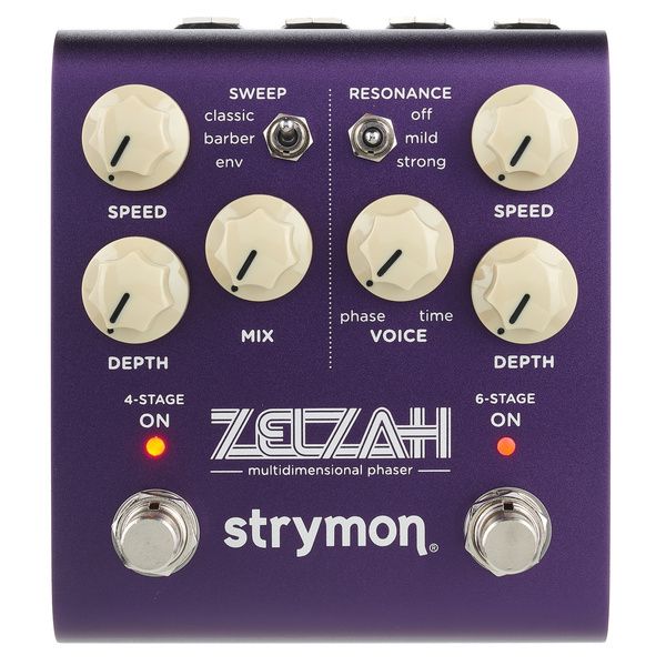 Strymon ZelZah Dual Phaser — стереофоническая педаль фэйзера с двумя независимыми блоками модуляции (4-stage и 6-stage). Архитектура основана на каскадах all-pass-фильтров с модифицированной временной характеристикой, что обеспечивает плавный переход от винтажного фазирования к пространственному хорусу. Конструкция включает дискретный высокоомный JFET-вход, 24-bit/96 kHz преобразование, ARM-DSP, отдельные footswitch-контуры для каждого модуля, стереосигнальный тракт с отдельной обработкой L/R и расширенные функции маршрутизации (Series, Parallel, Split). Педаль адаптирована для инструментального и линейного уровня входного сигнала, поддерживает MIDI-управление по TRS или USB-C, работу с expression-контроллерами и хранение пресетов.