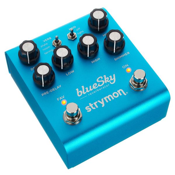 Strymon BlueSky V2 — педаль реверберации, построенная на премиальном аналоговом входном каскаде JFET и современном ARM-процессоре (520 МГц) с 32-битной плавающей точкой. Устройство предоставляет три алгоритма реверберации (Room, Plate, Spring), расширенные методы модуляции, а также Shimmer с независимой регулировкой и разными режимами обработки для каждого типа реверберации. Реализована стереофоническая работа с регулируемым режимом входного уровня (инструментальный/линейный), что делает педаль одинаково пригодной для гитарных сетапов, студийных трактов, синтезаторов и вокала. Есть поддержка MIDI через TRS-MIDI или USB-C. С помощью MIDI можно управлять параметрами педали, загружать и сохранять до 300 пресетов и прописывать автоматизацию внутри DAW. Конструкция выполнена в легком и прочном анодированном алюминиевом корпусе и оснащена двумя независимыми ножными переключателями — Bypass и Favorite — для быстрого вызова сохраненной конфигурации.