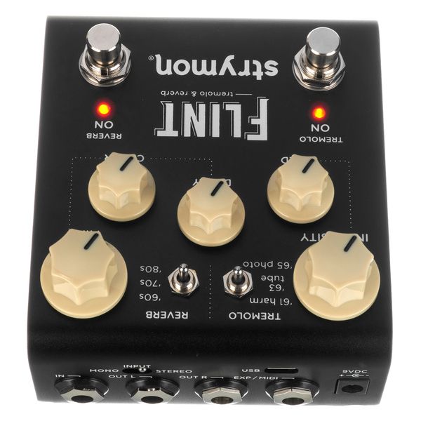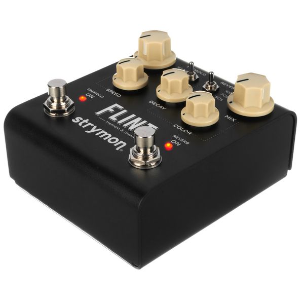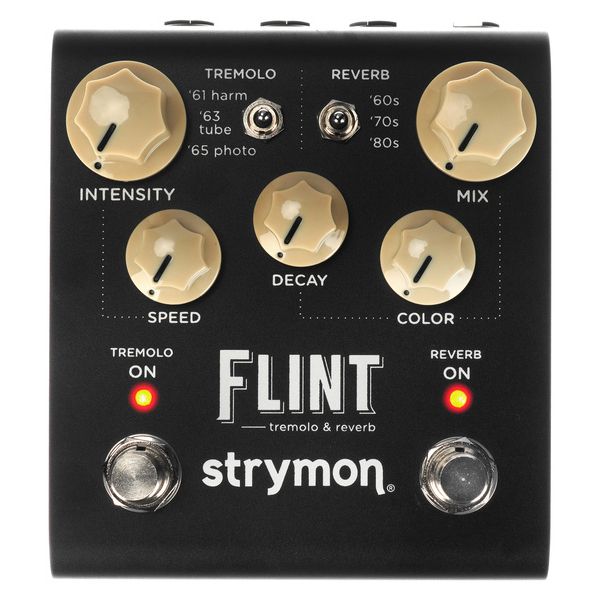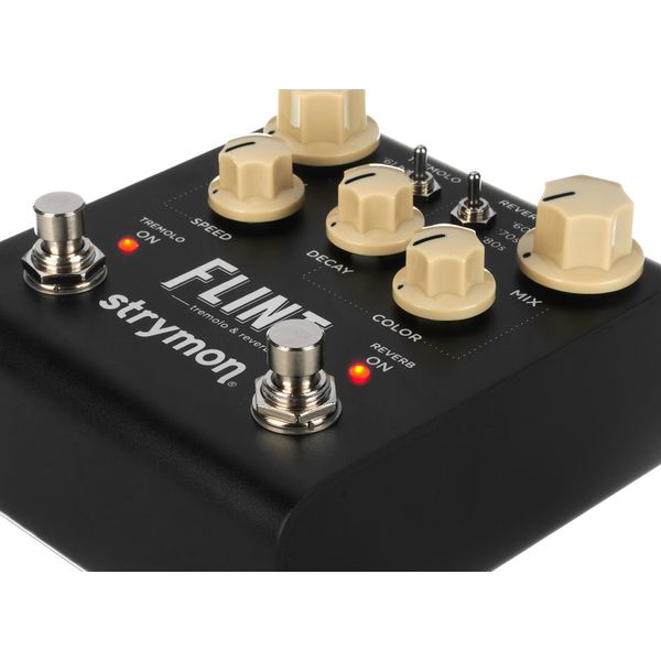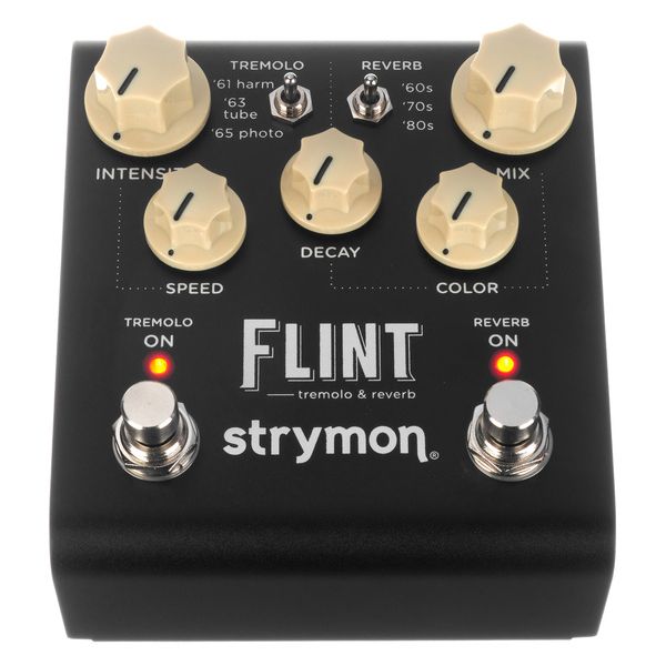 Strymon Flint V2 — цифровая педаль эффектов, совмещающая классическую пару «тремоло + реверберация» по образцу схем ламповых усилителей 1960-х годов и предназначенная для точной эмуляции трех исторических типов тремоло и трех типичных ревербераторов той эпохи. Конструкция включает два независимых цифровых движка с раздельными алгоритмами, управляемыми через расширенный пользовательский интерфейс, с возможностью последовательной перестановки порядка эффектов. Педаль построена на 520-МГц ARM-DSP с 32-битной плавающей точкой и использует 24-битные преобразователи 96 кГц, обеспечивая высокую точность огибающей, тембральных переходов и плотности отражений. Входной каскад выполнен на дискретном Class A JFET и рассчитан на работу в моно и стерео режимах, включая поддержку линейного уровня. Flint V2 поддерживает MIDI через TRS и USB-C, синхронизацию скорости тремоло по MIDI-Clock, храненит до 300 пресетов.