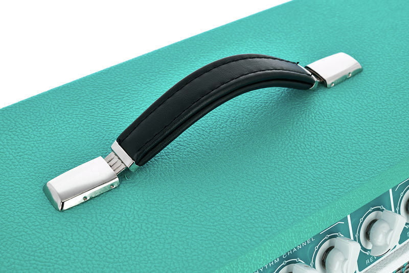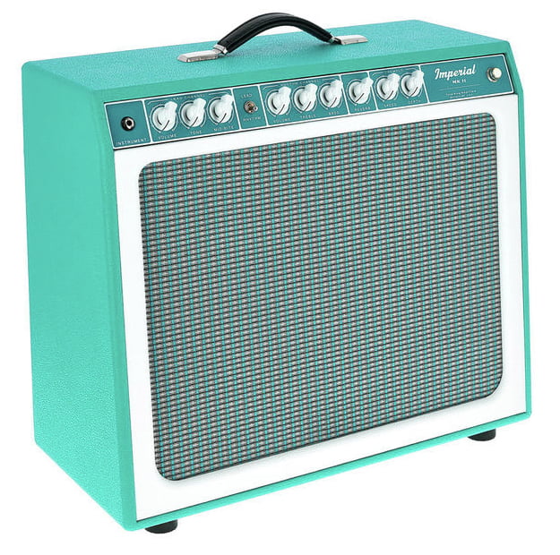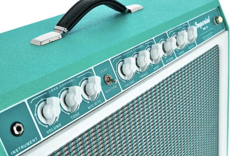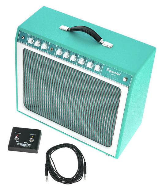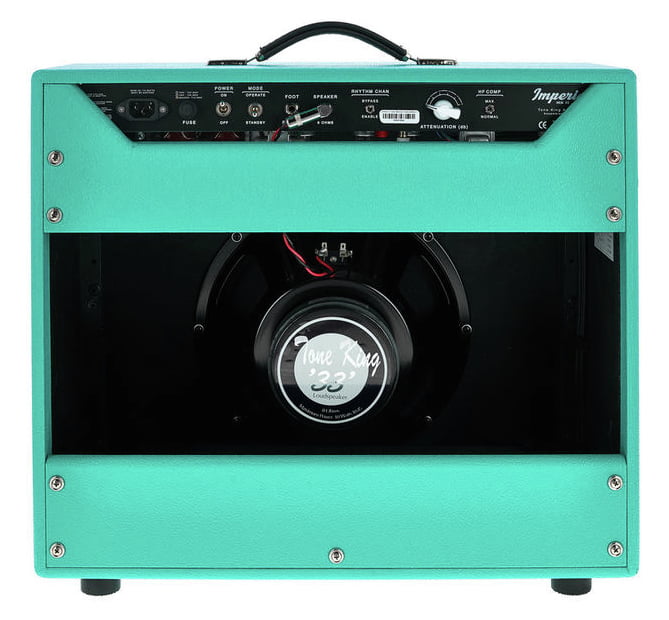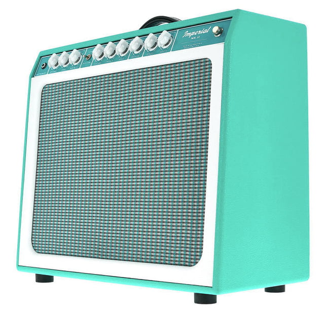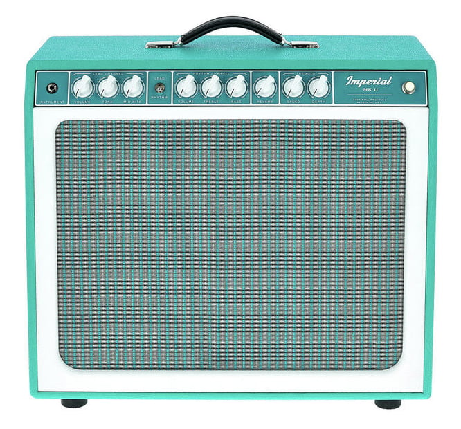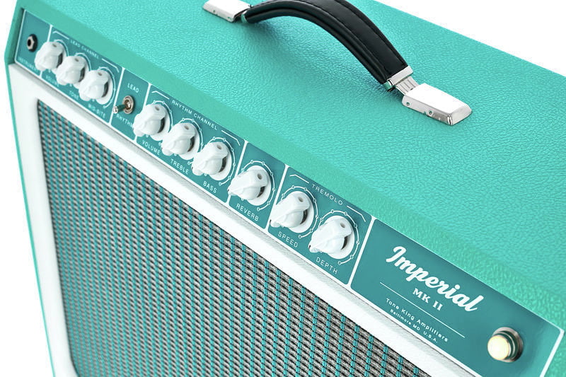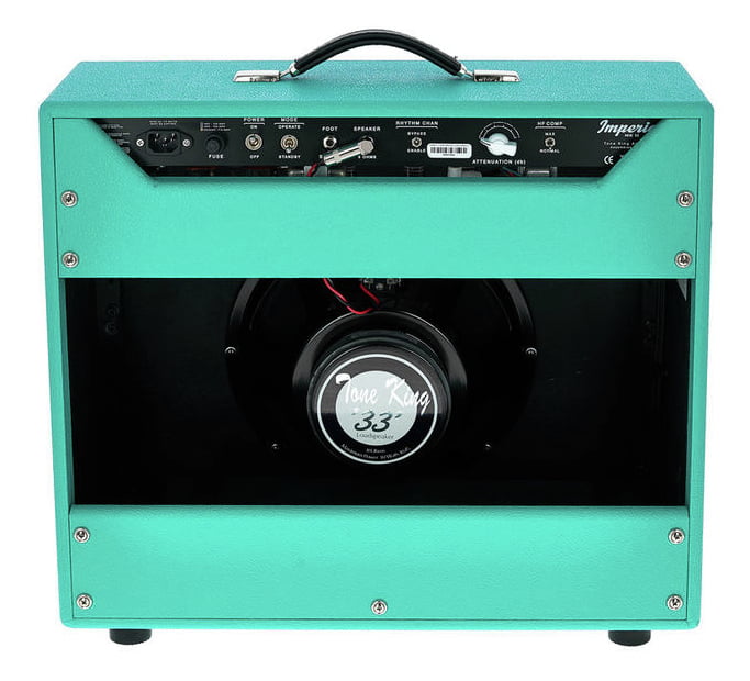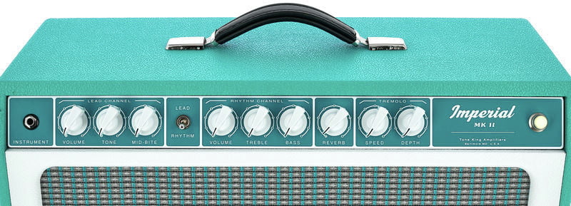Tone King Imperial Mk II Combo Turquoise — ламповый гитарный комбоусилитель мощностью 20 Вт с 12-дюймовым динамиком Eminence Tone King 33. Усилитель оснащён двумя независимыми каналами — Rhythm и Lead — с управлением через ножной переключатель. Канал Rhythm обеспечивает чистое, детальное звучание с высокой динамикой и запасом по громкости, тогда как канал Lead формирует мягкое и перегруженное звучание с плотными средними частотами и регулируемым параметром Mid-Bite. Встроенный аттенюатор Ironman II позволяет снижать уровень громкости без потери естественного отклика и насыщенности лампового тона, сохраняя динамику даже при минимальных уровнях. Пружинная реверберация и тремоло придают Imperial Mk II характерную глубину классических американских комбо-усилителей. Корпус выполнен из берёзовой фанеры.