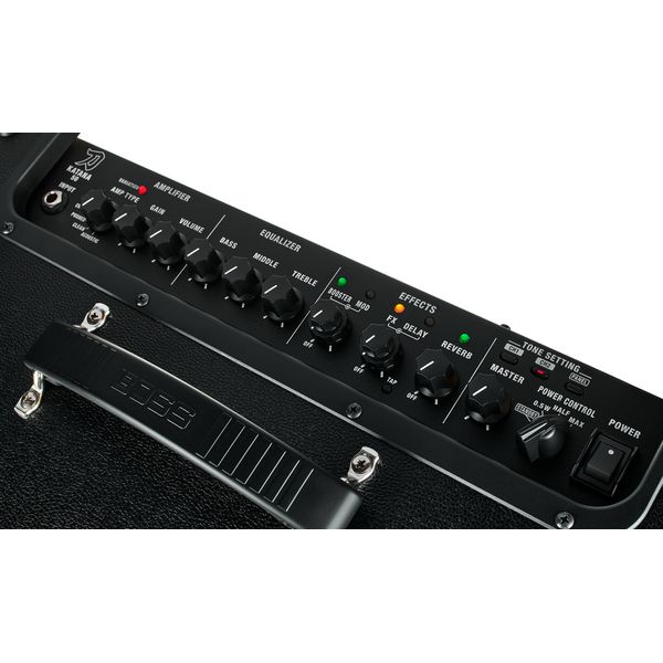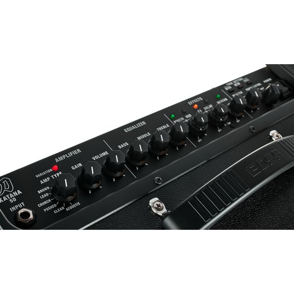 Boss Katana 50 Gen 3 — комбоусилитель третьего поколения, предназначенный для электрогитары. Устройство обладает мощностью 50 Вт и оснащено 12-дюймовым динамиком, обеспечивающим насыщенное и чистое звучание. Усилитель предлагает шесть типов усилителей, включая новый режим «Pushed», который идеально подходит для получения динамичного звучания на грани перегруза. Пять независимых секций эффектов (Booster, Mod, FX, Delay, Reverb) обеспечивают гибкость настройки звука. Katana 50 Gen 3 также поддерживает четыре пользовательских предустановки для быстрого доступа к любимым пресетам. Встроенная функция управления мощностью позволяет получать насыщенное звучание на любом уровне громкости. Возможности подключения включают USB для записи и слот для Bluetooth-адаптера, который можно использовать для беспроводного стриминга и управления через приложение Boss Tone Studio.