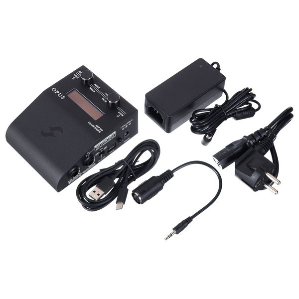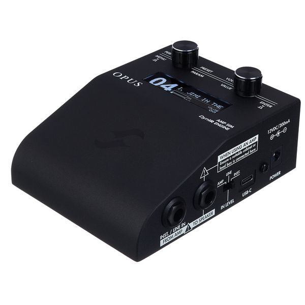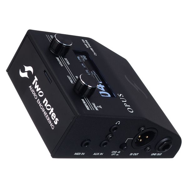 Two Notes Opus DI, Amp & Cab Sim — напольный эффект для электрогитары, объединяющий функции DI-интерфейса, моделирования усилителя и кабинета, предназначенный для профессиональной студийной работы, сцены и гибкой интеграции в педалборды. Устройство использует технологию моделирования лампового каскада с пятью моделями предусилителя и четырьмя моделями усилителя мощности, а также симуляцию кабинета DynIR с двойным микрофонным захватом, восемью микрофонами на кабинет и двенадцатью моделями акустического пространства. Opus DI предлагает 32 виртуальных кабинета, включая пресеты от Стива Стивенса, Дэйва Фридмана, Пита Торна, Джорджа Линча и Фила Икс. Аппарат имеет встроенные DSP-процессоры и эффекты, такие как Enhancer, шумоподавитель, настраиваемый эквалайзер с тремя режимами и реверберация. Интеграция с Torpedo Remote через USB и беспроводное соединение позволяет управлять пресетами, прослушивать более 600 кабинетов DynIR в реальном времени и настраивать звук на профессиональном уровне. Opus DI оборудован расширенным набором входов и выходов, включая MIDI, Aux, USB-C, Line и DI Out, а также поддерживает мониторинг через наушники.