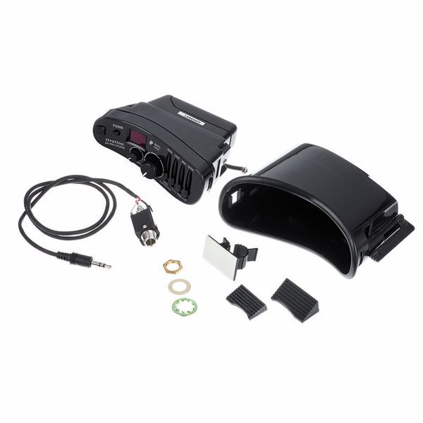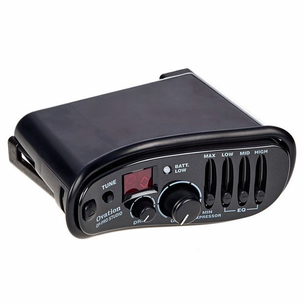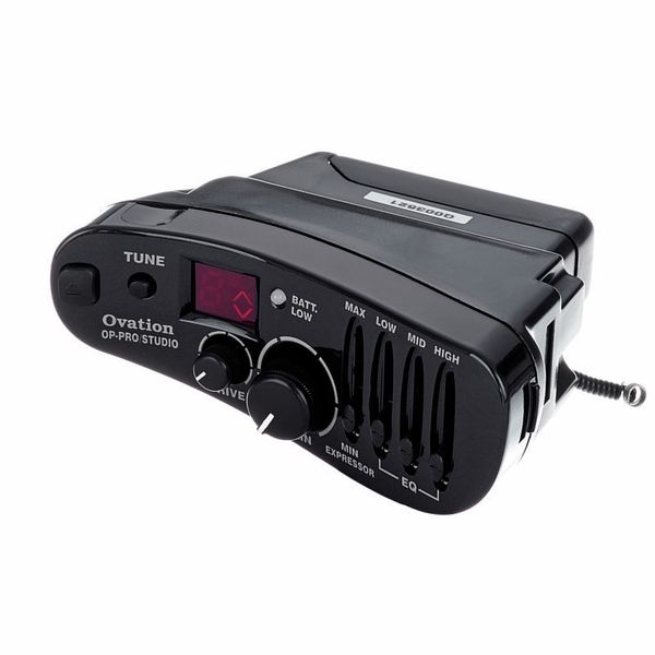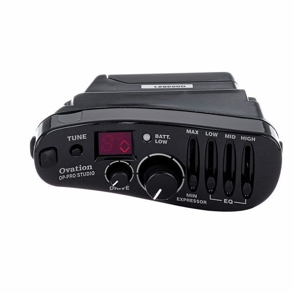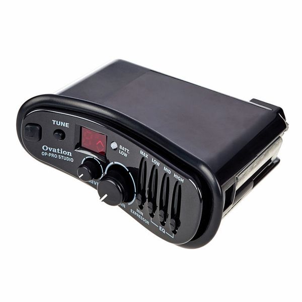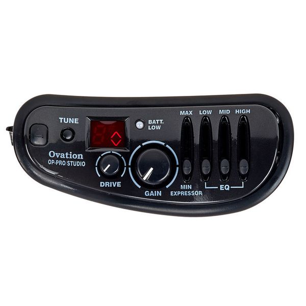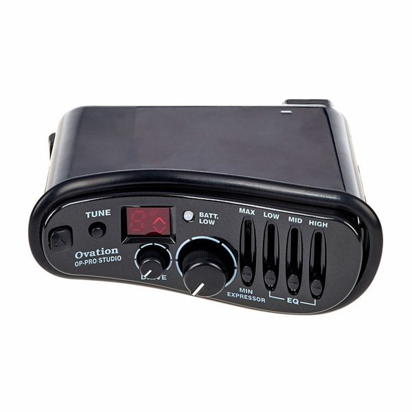 Ovation OP Pro Studio — специализированный усилитель для акустических гитар Ovation с динамической и гармонической обработкой, контрольной панелью, оптимизированной под работу с пьезоэлектрическими датчиками Ovation. Конструкция выполнена в виде вставного блока с интегрированным монтажным креплением, что обеспечивает стабильную фиксацию и облегченный доступ к элементам управления на верхней деке инструмента. Архитектура включает аналоговый тракт с регулируемым входным усилением, 3-полосный активный эквалайзер на низкие, средние и высокие частоты, схему Drive для управления гармоническим насыщением, а также слайдер Expressor, отвечающий за настройку эксайтера, компрессора и лимитера. Встроенный хроматический тюнер с функцией отключения сигнала обеспечивает бесшумную настройку, а светодиодная индикация служит как для работы тюнера, так и для диагностики состояния батареи. В комплекте идет монтажное крепление.