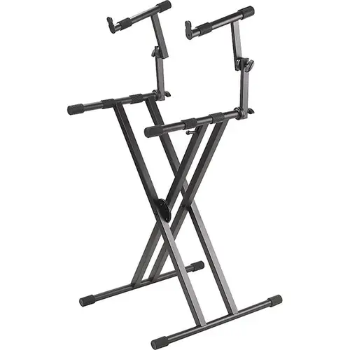 Самым популярным и распространенным видом установки под синтезатор является Х-образная стойка, которая состоит из двух металлических перекладин, скрещивающихся в центре. Такая конструкция подходит для большинства клавишных инструментов, легко регулируется по высоте и ширине. Для более динамичной экспрессивной игры используют двойные, усиленные подставки, которые не пружинят во время исполнения и способны удерживать более тяжелый вес синтезатора. Для экономии пространства и повышения функциональности используют многоярусные конструкции, позволяющие размещать сразу несколько музыкальных инструментов.