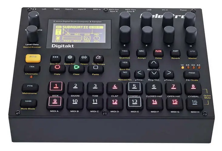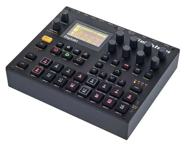 Elektron Syntakt — цифровая драм-машина и синтезатор. Работает на основе виртуального аналогового синтеза и FM-синтеза. Располагает 12 каналами, в том числе выделенным FX-каналом. Каждый канал работает в режиме аудио или MIDI, с функцией управления параметрами velocity, pitch bend и aftertouch, и 4-голосной полифонией.