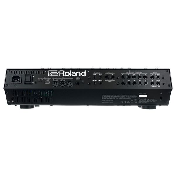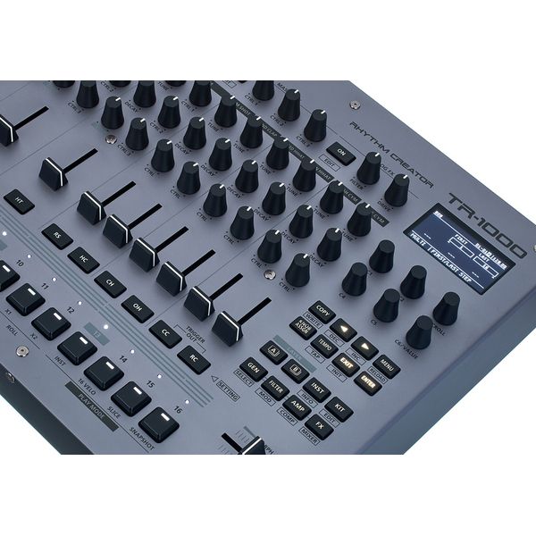 Roland TR-1000 Rhythm Creator — первая за 40 лет полностью аналоговая драм-машина Roland, объединившая наследие культовых моделей TR-808 и TR-909 с современными цифровыми технологиями. Звуковой движок построен на 16 аналоговых схемах (ACB, FM, PCM). Устройство предлагает десять треков ударных, четыре из которых многослойные и позволяют комбинировать аналоговые движки с цифровыми. Каждый слой оснащён собственными секциями фильтрации, динамической обработки и эффектов. Встроенный сэмплер с памятью 64 ГБ поддерживает загрузку пользовательских звуков, работу с лупами и слайсами, тайм-стретчинг и ресемплинг. Примечательно, что каждый слайс может иметь независимые настройки высоты тона и тайм-стретчинга. TR-1000 снабжена аналоговым мастер-фильтром с драйвом, цифровыми эффектами (реверберация, дилей, стерео-модуляция, компрессия, биткрашер, DJ-looper, Scatter) и расширенным секвенсором на 16 шагов с вариациями A–H и возможностью создания fill-in паттернов, микро-таймингом, настройкой длины паттерна для каждого канала, автоматизацией, вероятностью шагов, комплексными режимами проигрывания паттерна, функциями rotate и shuffle. Для визуальной обратной связи предусмотрен OLED-дисплей. Также имеется регулятор Morph, управляемый кроссфейдером, который позволяет плавно перемещаться между несколькими конфигурациями параметров, и функция Snapshot для быстрого вызова сохраненных настроек. Каждая ручка в секции настройки инструмента может работать как макро-контроллер, управляющий сразу несколькими параметрами TR−1000. При этом для каждого параметра можно задать индивидуальный настраиваемый диапазон. Play Mode позволяет переключать Step Keys между режимами запуска слайсов и 16 уровней Velocity (по аналогии с AKAI MPC). TR-1000 выполнен в серебристо-черном корпусе с широкими возможностями коммутации, включая отдельные выходы на каждый канал, CV и MIDI-порты, USB-C и поддержку фирменного приложения TR-1000 App для управления пресетами, библиотекой сэмплов и загрузки обновлений.