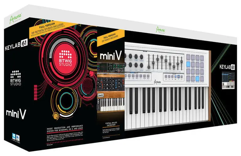 25-клавишная динамическая MIDI клавиатура полувзвешенного типа, Velocity&Aftertouch, программное обеспечение Analog Lab, Bitwig Studio, а также Mini V; 1000 различных звуков, пресеты типов Pitch&Modulation, Arturia Classic Synth, Jack-входы педалей сустейна (1/4″), экспрессии, а также AUX, MIDI In/Out и USB.