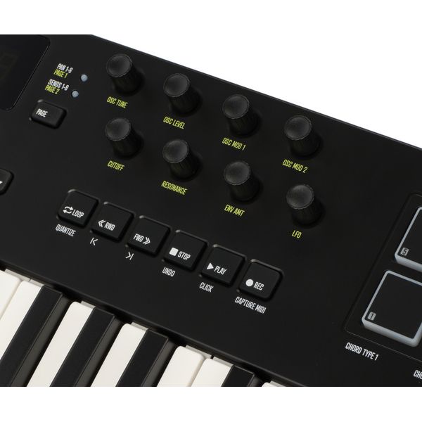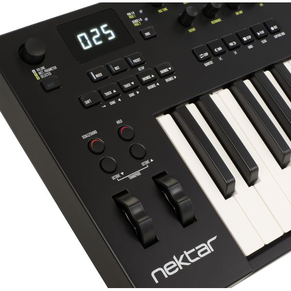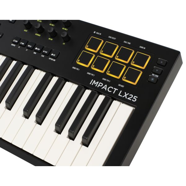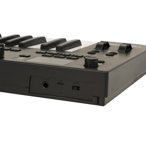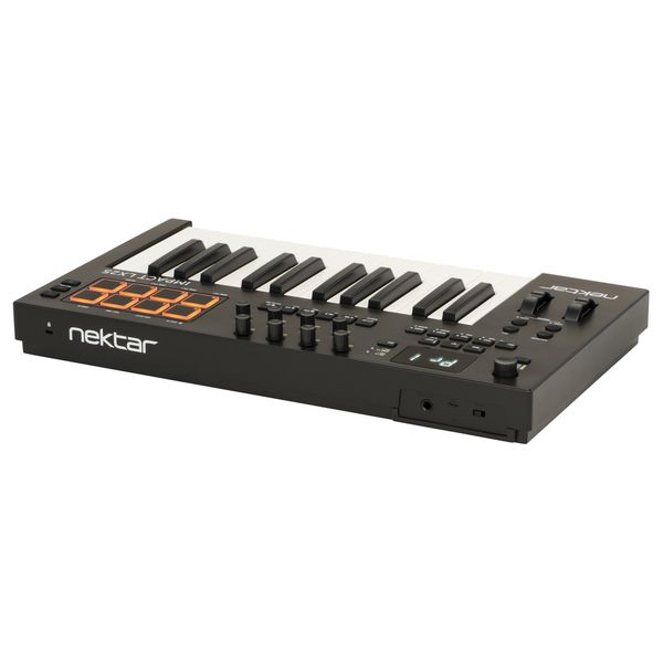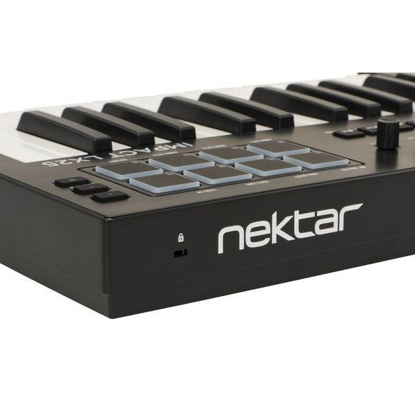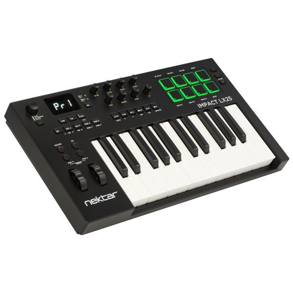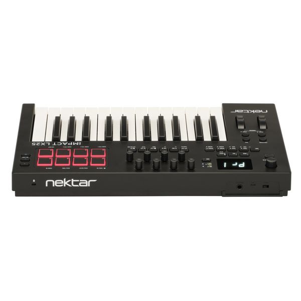 Nektar Impact LX25 MK3 — компактный и функциональный MIDI-контроллер с 25 клавишами, ориентированный на продюсеров, работающих в DAW-среде. Контроллер отличается обновлённым Feel-keyboard без взвешивания, двухколёсным контролем – Pitch Bend и Modulation, и расширенным контролем через 8 энкодеров, 8 velocity-чувствительных LED-пэдов, большие encoder-колёса и кнопки транспорта. В комплект входят функции Scale, Chord и Hold, что позволяет быстро адаптироваться к музыкальным идеям, а интеграция с DAW от Nektar и поддержка NKS позволяют использовать более 2000 совместимых плагинов. Контроллер питается через USB-C, есть вход для педали (sustain), предусмотрена поддержка сотовых переходников (USB-C ↔ USB-A), набор программного обеспечения для старта: Bitwig Studio 8-Track, Komplete Select 15 и синт-плагин MOK Miniraze. Устройство сочетает в себе портативность и достаточное число элементов управления, чтобы быть удобным в студии и на сцене.