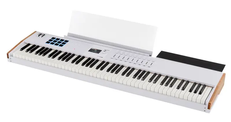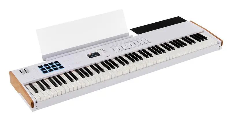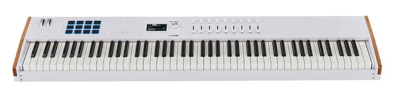 Устройство поддерживает режимы арпеджиатора, аккордов, игры по выбранной тональности, а также имеет колеса питча и модуляции. Для управления DAW предусмотрены кнопки транспортной панели (воспроизведение, пауза, сохранение, отмена и др.). Клавиатура имеет входы для педалей (sustain, expression, auxiliary), MIDI-вход и выход, работает от USB-C. Клавиатура выполнена в прочном алюминиевом корпусе с деревянными боковыми панелями. В комплекте идет флагманское ПО Analog Lab.