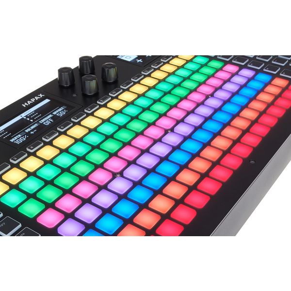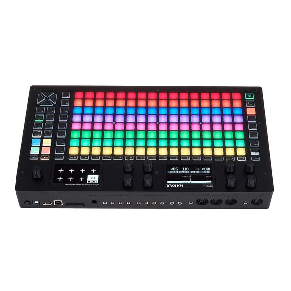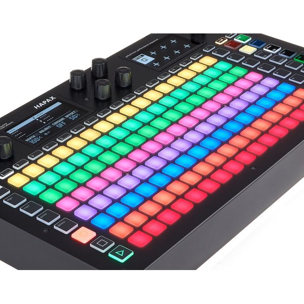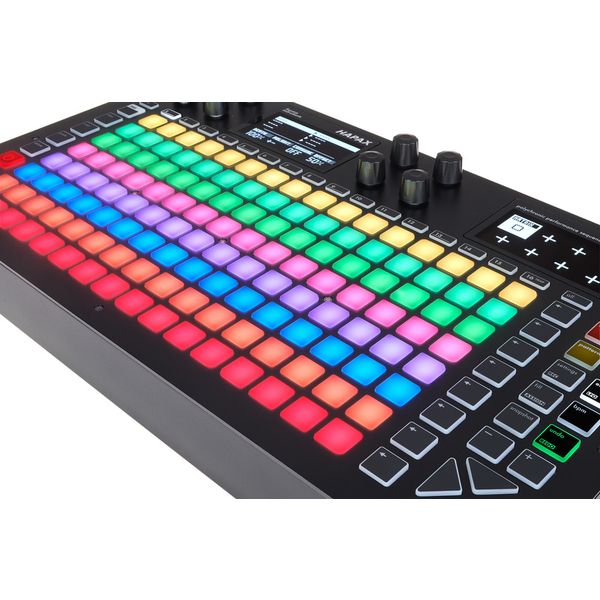 Squarp Instruments Hapax — автономный MIDI-секвенсор с поддержкой MPE. Hapax оснащен двухпроектной архитектурой, позволяющей одновременно работать с двумя независимыми проектами, что удобно для живых выступлений и плавных переходов между композициями. В секвенсоре доступны многофункциональные инструменты для создания музыки — от полифонических и MPE треков для мелодий до продвинутого драм-секвенсора, который позволяет контролировать до восьми инструментов в одной дорожке. Hapax предлагает большое разнообразие MIDI-эффектов (до 7 одновременно на одном треке), таких как арпеджиатор, генератор случайных событий, гармонизатор (для создания гармоний и аккордов), евклидов ритм и другие, а также проектные LFO с детальной автоматизацией параметров. Одной из ключевых особенностей являются алгоритмы генерации и трансформации нот — например, умное гармоническое инвертирование мотивов, создание контролируемых случайных мелодий, плавное нарастание скорости исполнения или акцентирование определенных долей. Это позволяет музыкантам быстро создавать сложные и выразительные музыкальные фразы, не требуя сложных знаний теории музыки. Кроме того, Hapax поддерживает высококачественную запись MIDI с разрешением 192 ppqn, позволяя фиксировать как MIDI-выходы интерфейсов (в том числе с MPE), так и внутренние данные контроллеров и 128 RGB пэдов, со встроенным лупером, метрономом. Для удобства работы предусмотрены функции отмены/повтора, моментального сохранения состояний (snapshot), продвинутые операции копирования/вставки и другие. Корпус аппарата изготовлен из 2-миллиметрового алюминия с задней панелью из прочного ABS.