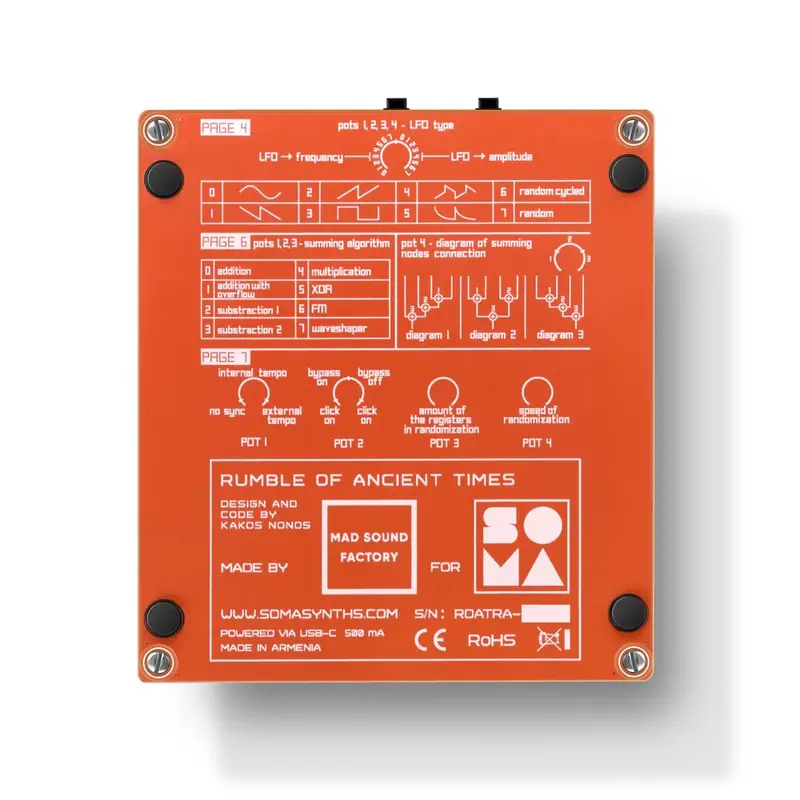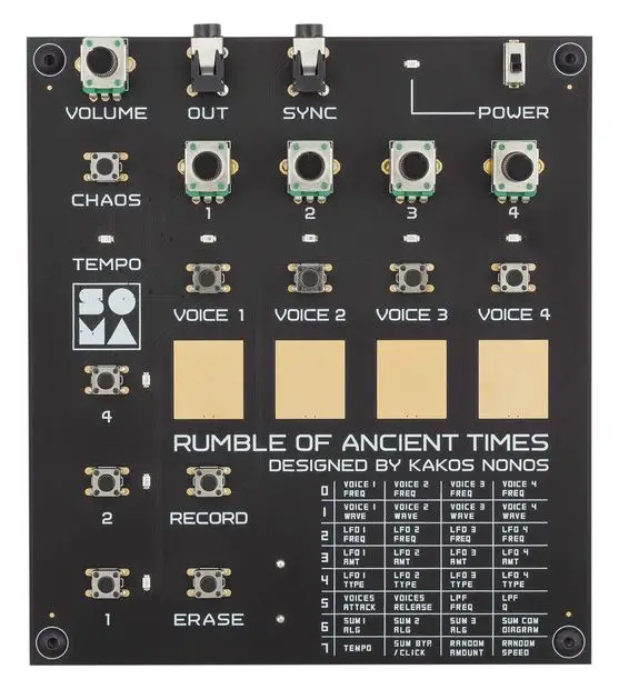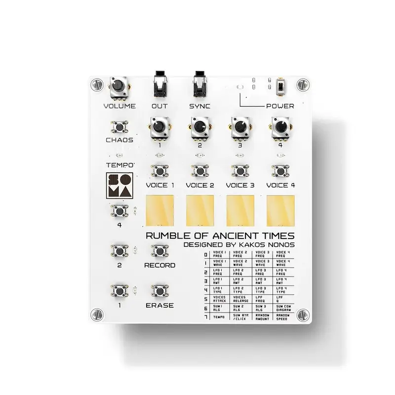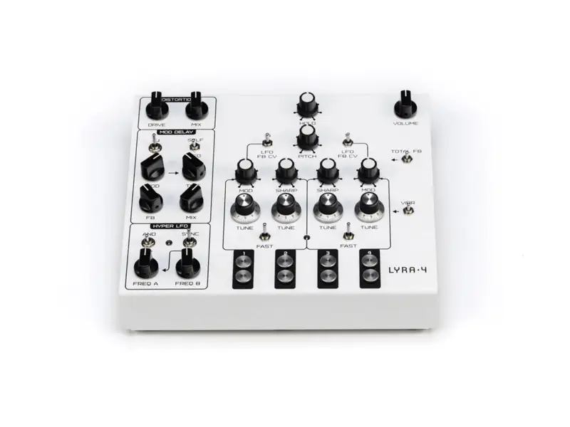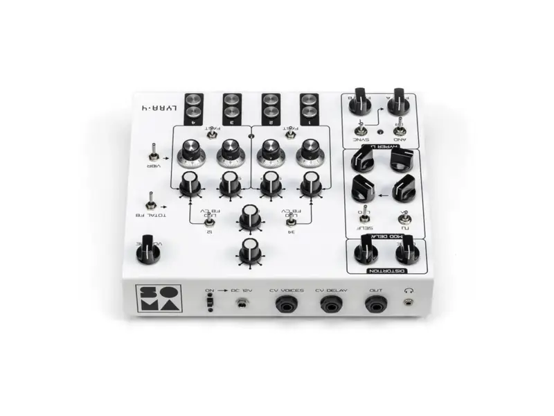 SOMA Laboratory Lyra-4 Black — компактный дрон-синтезатор, основанный на четырех генераторах, называемых "голосами". Эти голоса не являются классическими VCO, их работа ближе к тон-генераторам старых электронных органов, с выраженной нелинейностью. Lyra-4 работает в режимах электрического органа и FM-синтеза. Помимо генераторов, синтезатор оснащен гипер-LFO, который состоит из двух простых LFO, создающих сложные волны для управления параметрами, и мод-дилеем с функцией самомодуляции. Последним в цепи сигнала стоит встроенный блок дисторшна. Модель выполнена в прочном корпусе.