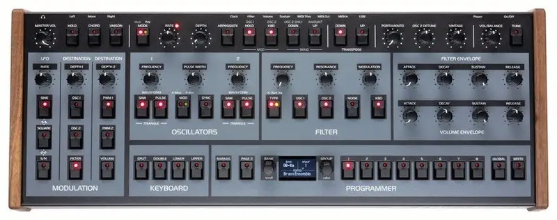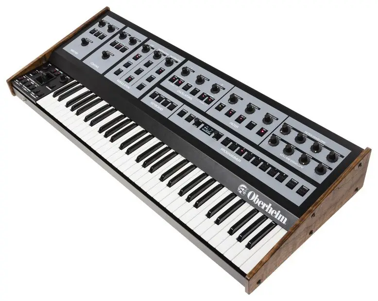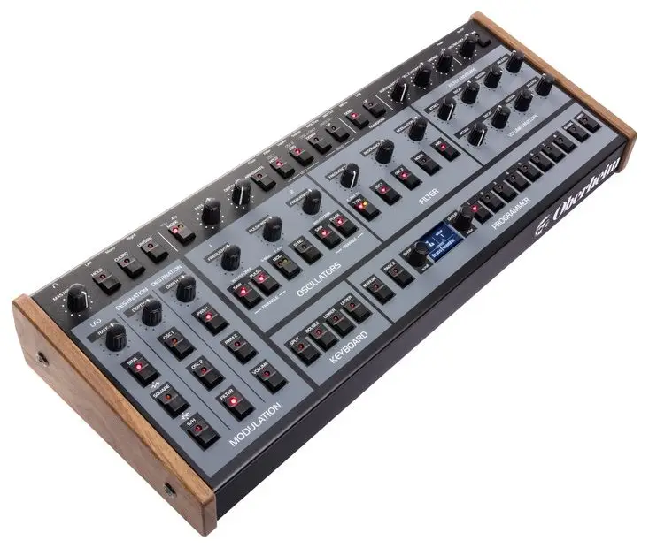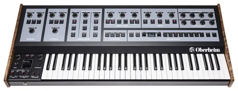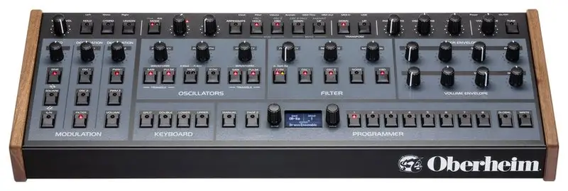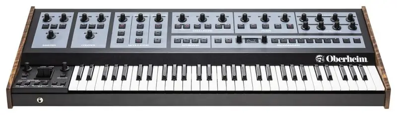 Oberheim TEO-5 — 5-голосный полифонический аналоговый синтезатор с двумя VCO и сабосциллятором на каждый голос. Каждый осциллятор предлагает треугольную, пилообразную и переменную прямоугольную формы волн, а также возможность модуляции hard sync и X-Mod с FM. На борту также предусмотрены классический фильтр SEM с двумя режимами работы, две огибающие DADSR, два LFO с пятью формами волн и синхронизацией по темпу. "Vintage" регулятор добавляет вариации в поведении компонентов для имитации винтажного звучания. Встроены арпеджиатор, 64-шаговый полифонический секвенсор и мультиэффекты, включая реверберацию, задержку, хорус, фленджер и фазер. Клавиатура Fatar на 44 полувзвешенные клавиши с чувствительностью к скорости и каналом aftertouch. 256 заводских и 256 пользовательских пресетов. Интегрированный блок питания.