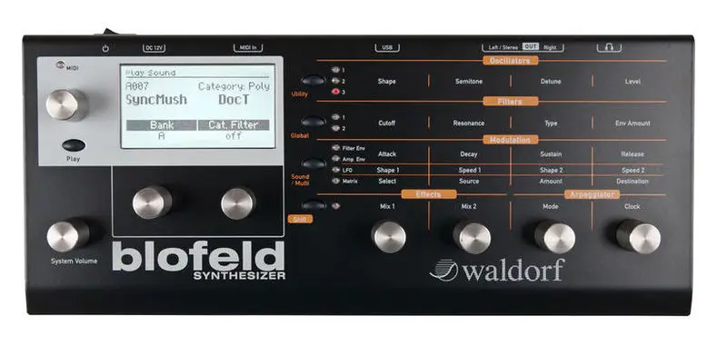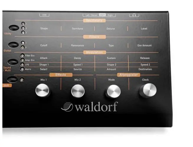 Так же как и синтезатор Blofeld, Waldorf Pulse 2 находится в прочном металлическом корпусе. Он также имеет большой жидкокристаллический дисплей 128×64 с подсветкой и восемь ручек из нержавеющей стали для просмотра параметров матрицы устройства, настройки громкости и редактирования отображения доступных параметров.