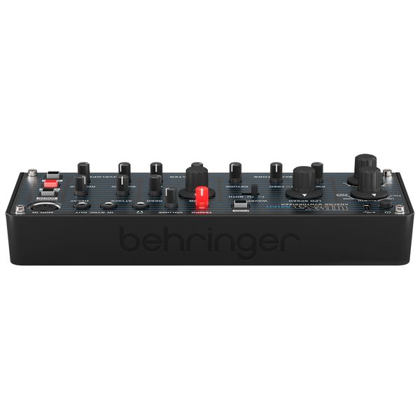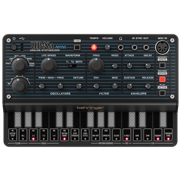 Behringer UB-Xa Mini — компактный полифонический аналоговый синтезатор, копирующий схему OB-Xa. Конструкция основана на полностью аналоговом тракте генерации сигнала: три VCO с пилообразной и прямоугольной формами волны, аналоговый VCF, аналоговые огибающие и VCA. Модель оснащена мини-клавиатурой на 27 клавиш, рассчитанной на работу в портативных сетапах, с прямым доступом ко всем параметрам синтеза на верхней панели. Управление звуком реализовано через кольцевой модулятор, LFO с тремя формами волны и ADSR-огибающие. Встроенный 16-шаговый motion-секвенсор с записью движений контроллеров расширяет возможности создания подвижных тембров. Поддерживаются режимы игры Poly, Unison, Octaves, Fifths, Ring Unison, Ring Poly для разного поведения голосов и осцилляторов. Синхронизация реализована через MIDI, USB-C и аналоговые mini-jack I/O.