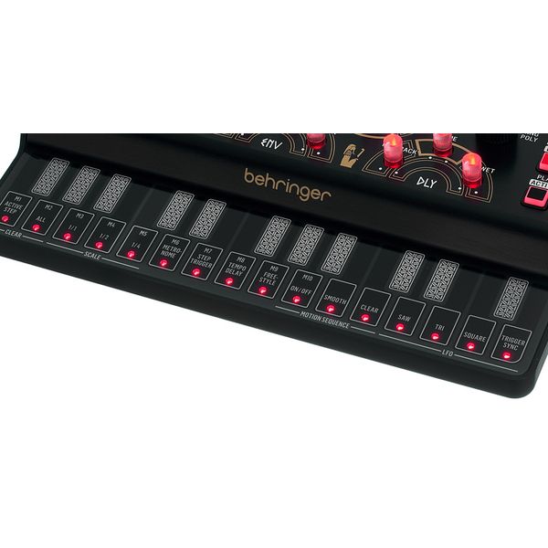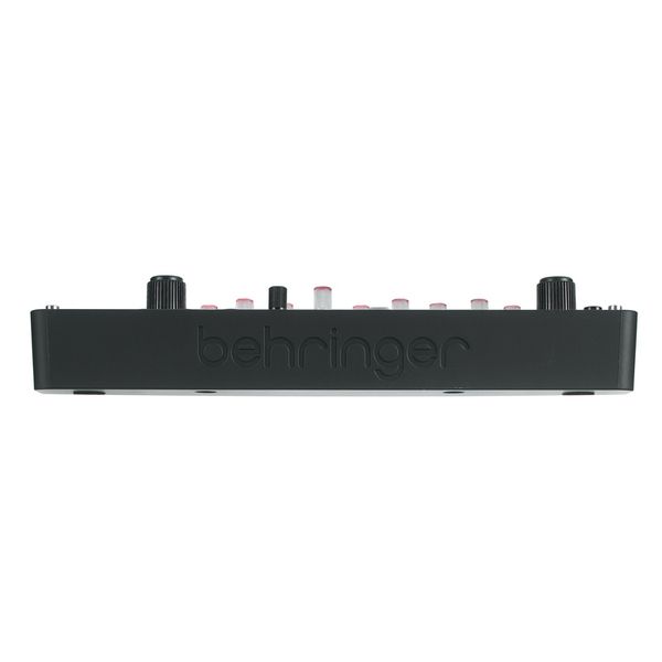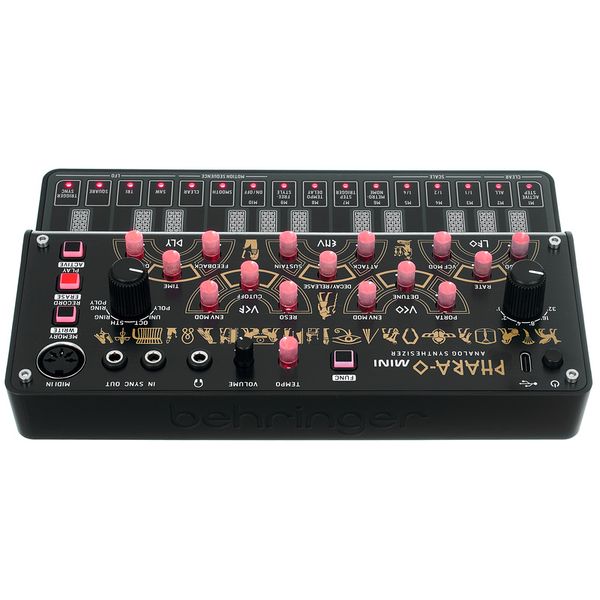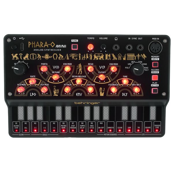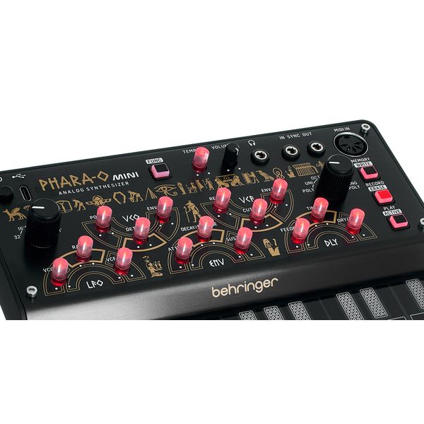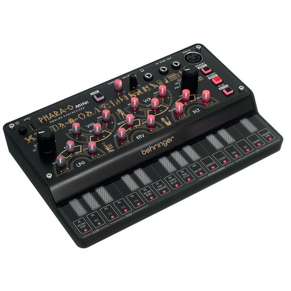 Behringer Phara-O Mini — компактный полифонический синтезатор, который обладает встроенной памятью для сохранения настроек и паттернов и полностью аналоговым трактом генерации и обработки звука, который построен на дискретных схемах VCO, VCF и VCA. Инструмент имеет три голоса и три независимых осциллятора с пилообразной и прямоугольной формами волн, а также функциями детюна и портаменто. В тракте используется резонансный низкочастотный фильтр с крутизной 12 дБ/октава, выполненный по винтажным схемам 1970-х годов. Для добавления характера есть LFO, кольцевой модулятор (предназначенный для квадратных волн) и встроенный эффект задержки с настраиваемыми параметрами времени, обратной связи и баланса. Инструмент оборудован 16-шаговым секвенсором с возможностью записи изменений параметров в реальном времени и сохранения паттернов. Управление осуществляется с помощью 27 кнопок клавиатуры, аппаратных регуляторов и через MIDI, с поддержкой CC и NRPN для всех параметров. Питание и MIDI-интерфейс реализованы через USB-C, а для подключения предусмотрены аналоговый аудиовыход, выход на наушники и входы/выходы синхронизации.