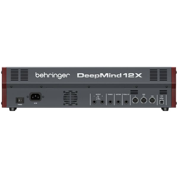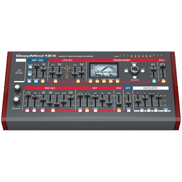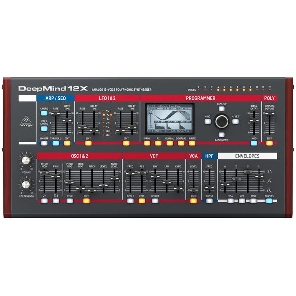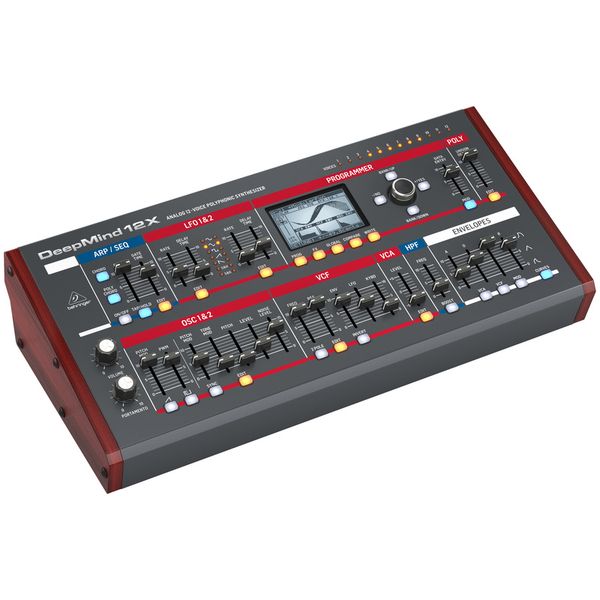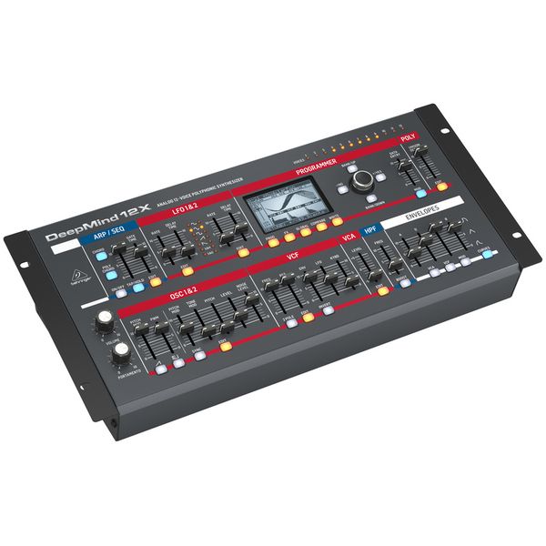 Behringer DeepMind 12X — аналоговый 12-голосный полифонический синтезатор в компактном настольном и рэковом исполнении (в комплекте крепления для установки в стойку), сочетающий классическую архитектуру VCF/VCA с современной цифровой секцией эффектов и встроенным WiFi-модулем. Инструмент построен на чистом аналоговом сигнальном тракте с фильтрами и стерео VCA, обеспечивая аутентичное, плотное и динамичное звучание. Каждый из 12 голосов оснащён двумя аналоговыми осцилляторами с синхронизацией и параметрическим drift для воссоздания винтажной нестабильности. OSC1 формирует Sawtooth и Square/Pulse с PWM, OSC2 — Square/Pulse; дополнительно предусмотрен глобальный генератор шума. Архитектура поддерживает расширенные режимы Unison и Poly с детюном, панорамированием и дрейфом до 12 голосов на ноту. Фильтрация реализована аналоговым Low Pass с переключаемым срезом 12/24 дБ/окт и регулируемым резонансом (на каждый голос), дополненным глобальным High Pass 6 дБ/окт с переключателем Bass Boost. На каждый голос доступны 3 четырёхступенчатые ADSR-огибающие (VCF, VCA, MOD) с непрерывно изменяемой формой кривой (Linear / Exponential / Reverse Exponential), режимами Legato, Mono и Retrigger, возможностью триггера от клавиши, LFO или секвенсора и работой вплоть до аудиодиапазона. Два LFO на голос предлагают 7 форм волн (Sine, Triangle, Square, Ramp Up, Ramp Down, Sample & Hold, Sample & Glide), Key Sync, MIDI Sync, Delay, Fade In, регулируемый slew-rate и функцию Phase Link. 8-канальная матрица модуляции (более 20 источников и свыше 130 назначений, включая параметры эффектов) обеспечивает глубокую маршрутизацию и возможность создания динамичных тембров. 32-шаговый Control Sequencer поддерживает значения от −127 до +127, управление Note, Tie, Length, Slew и Swing с MIDI-синхронизацией. Продвинутый арпеджиатор с Tap Tempo работает до 6 октав, предлагает 32 пресетных ритмических паттерна (до 32 шагов) и режимы UP, DOWN, UP-DOWN, UP-INV, DOWN-INV, UP-DN-INV, UP-ALT, DOWN-ALT, RAND, AS-PLAYED и CHORD. Реализованы функции Chord и PolyChord Memory (до 12 нот, 36 ячеек памяти). Секция эффектов включает 4 одновременно используемых FX-процессора TC Electronic, Klark Teknik и Midas (более 30 алгоритмов: Reverb, Delay, Chorus, Flanger, Phaser, Multiband Distortion и др.), работающих на SHARC DSP с 32/40-бит с плавающей точкой, 48 кГц; АЦ/ЦА — 24-бит / 48 кГц с динамическим диапазоном 114 дБ. Предусмотрен режим True Hard Bypass для обхода эффектов. Управление осуществляется через 26 фейдеров, 33 переключателя, энкодер и регуляторы; LCD-дисплей с подсветкой обеспечивает быстрый доступ к меню PROG, FX, GLOBAL, COMPARE, WRITE и разделам ARP/SEQ, LFOs, OSCs, POLY, VCF, VCA, ENV и MOD MATRIX. Доступно 1024 пользовательских программы (8 х 128) с функцией Compare & Match.