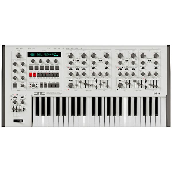UDO Audio DMNO Black — 8-голосный гибридный синтезатор, построенный на базе чипов FPGA. Звуковое ядро состоит из двух независимых 4-голосных движков (DMNO 1 и 2), которые могут работать в 8 режимах (Single, Dual, Split, Series и др.), позволяя гибко маршрутизировать сигнал — например, подавать выход первого движка в микшер осцилляторов второго. Каждый голос оснащен двумя цифровыми осцилляторами с поддержкой Super-wave (наложение фазосмещенных копий волны), пользовательских вейвтейблов и широкими возможностями модуляции (Cross-mod, PWM, Sync). Ключевым звеном является бинауральный аналоговый тракт: в этом режиме голоса объединяются в «супер-голоса» (4 пары), где каждый канал имеет независимую фильтрацию и модуляцию. Система фильтрации представлена новой схемой Dynamic Multi-Core Stereo VCF, которая позволяет переключать конфигурации (последовательная, параллельная или стерео) и типы фильтров (LP, HP, BP, Notch, Phaser) «на лету». Инструмент также включает 32-битный DSP-блок эффектов (реверб, дилей, хорус, EQ), 64-шаговый секвенсор и развитую коммутацию, включая USB-аудиоинтерфейс (24-бит), CV/Gate выходы и стереовход с детектором огибающей для обработки внешних сигналов.