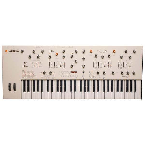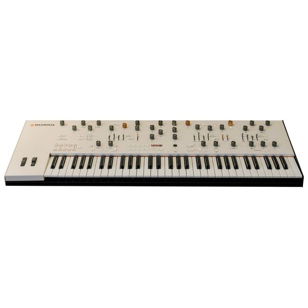 Frap Tools Magnolia — полифонический аналоговый клавишный синтезатор, разработанный на основе технологий модульных систем Eurorack. Инструмент посмотрен на архитектуре из восьми независимых голосов, каждый из которых построен на двух осцилляторах. Ключевой особенностью модели является линейная FM-модуляция с проходом через ноль (through-zero), позволяющая получать более стабильные и музыкальные тембры. Осцилляторы поддерживают плавное переключение форм волн, sync-модуляцию, управление гармониками и широтно-импульсную модуляцию. Сигнал проходит через аналоговый микшер, резонансные фильтры верхних и нижних частот и стерео VCA с функцией насыщения. Для модуляции предусмотрены цифровые LFO и огибающие с режимом зацикливания, а также модуль Polymove для случайной полифонической модуляции параметров каждого голоса. Синтезатор оснащён 61-клавишной клавиатурой Fatar с чувствительностью к силе нажатия и полифоническим aftertouch, арпеджиатором, пошаговым секвенсором и встроенными эффектами хоруса и задержки.