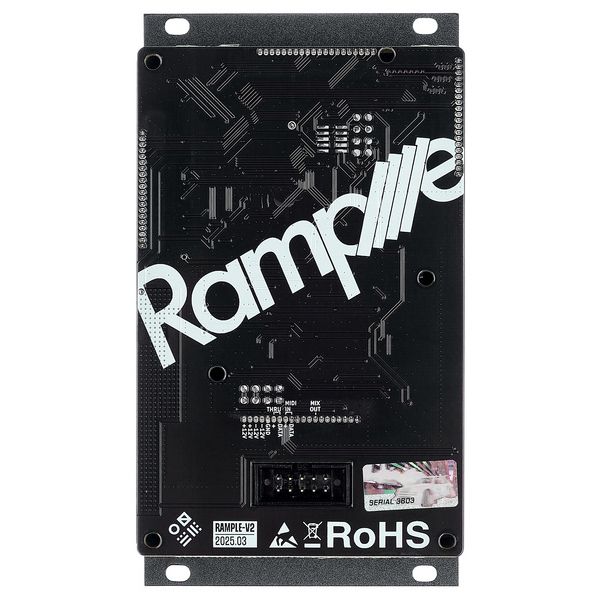 Squarp Instruments Rample Turbo — Eurorack-сэмплер с обновленным ЦАП, переработанным аналоговым трактом и улучшенной схемой шумоподавления, обеспечивающей более чистый и детализированный сигнал. Модуль имеет 4 независимых канала и воспроизводит wav любой длительности напрямую с microSD с минимальной задержкой, поддерживает до 2600 китов и многослойные наборы (до 12 слоев на голос). Каждый голос оснащен собственным набором эффектов (Pitch, Bits, Filter, Freeze, Levels) и расширенными параметрами редактирования (точка старта, длина, A/D, режимы запуска, mute). DC-связанные моно-выходы позволяют работать как с аудиосигналами, так и с CV. Управление осуществляется через четыре CV-входа (от -5 до +5 V), четыре Gate-триггера, MIDI-вход TRS Type A с возможностью хроматической игры и управления всеми параметрами через MIDI CC, а также через энкодер, шесть аппаратных кнопок и матричный LED-экран. Модуль комплектуется библиотекой из более чем 200 наборов сэмплов.