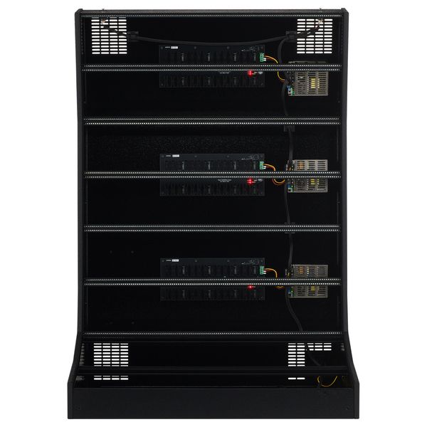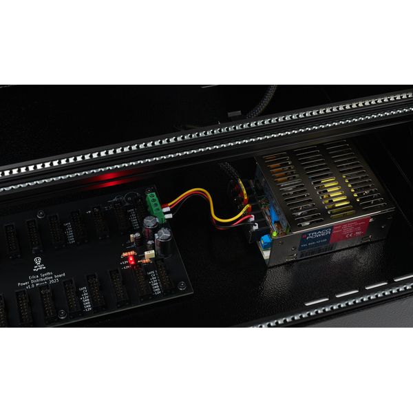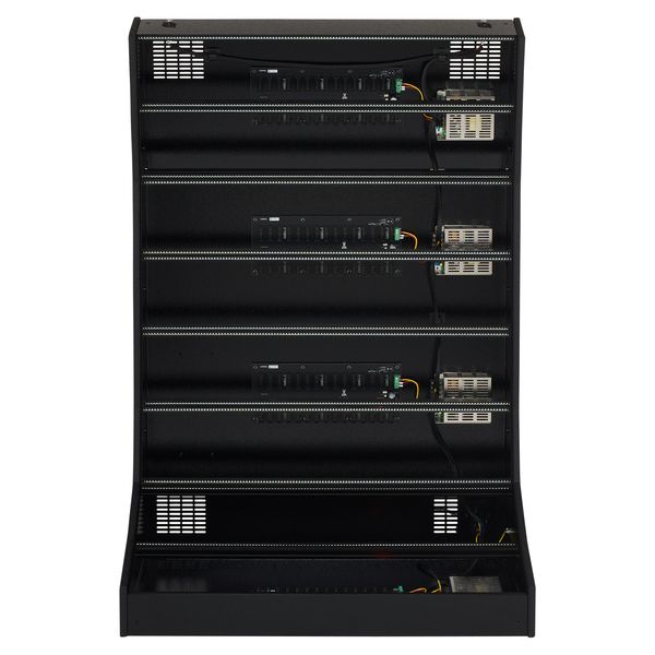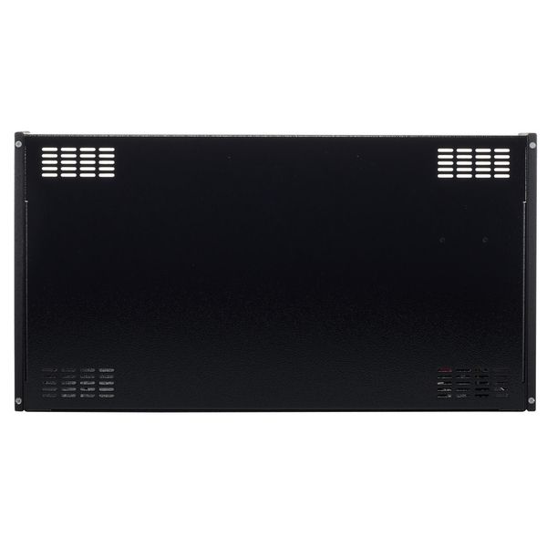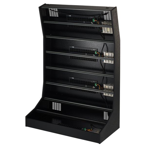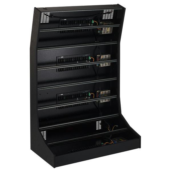 Erica Synths Megasystem — массивный 6U корпус для модульных систем Eurorack. Megasystem сочетает в себе элегантный дизайн и функциональность, предлагая 6 рядов по 126 HP, что в сумме даёт 756 HP пространства для модулей. Встроенный блок питания обеспечивает стабильную работу системы, поддерживая 9A на +12 В, 4,5A на -12 В и 1A на +5 В. Корпус выполнен из алюминия с боковыми панелями, что придаёт ему прочность и стильный внешний вид. Дополнительно предусмотрены два 4-контактных XLR-разъёма для подключения гусеничных ламп (не входят в комплект).