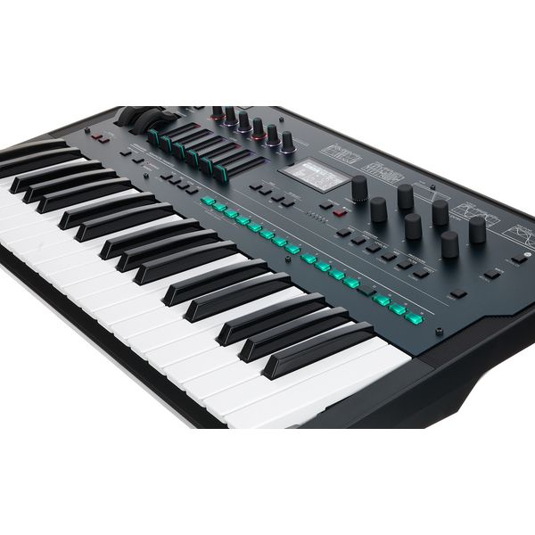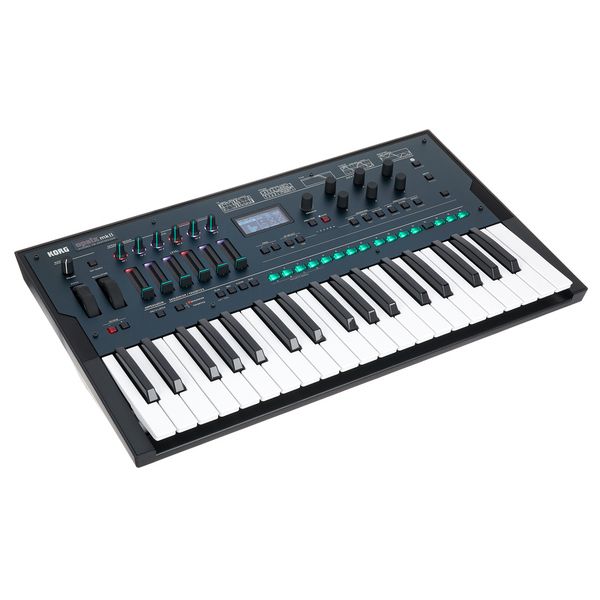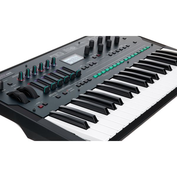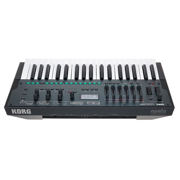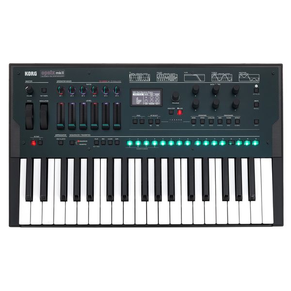 Korg Opsix MKII - синтезатор с Altered FM архитектурой: 6 операторов с 5 режимами (FM, Ring Mod, Filter, Filter FM, Wave Folder). 64 голоса полифонии. Фильтры аналоговые, как в MS-20 и PolySix. Встроенные спектроанализатор и осциллограф визуализируют работу движка. Операторный микшер позволяет интуитивно изменять параметры звука. На борту 30 типов эффектов, таких как хорус, фазер, задержка и компрессор. Секвенсор на 16 шагов с возможностью записи до 6 нот на шаг. Полифонический арпеджиатор и мощная матрица модуляции с 40 предустановленными алгоритмами синтеза с возможностью кастомизации.