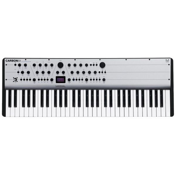 Modal Carbon8X — цифровой синтезатор с 8‑голосной полифонией и клавиатурой FATAR TP9/S с 61 клавишей с velocity и aftertouch. В каждой голосовой цепи — 2 осциллятора, в сумме 16, генерирующих 56 волн в реальном времени. Синтезатор предлагает 34 типа фильтров, включая аналоговые, морфинг и резонансные. Есть три ADSR-генератора и три LFO с 15 формами волны. Секвенсор поддерживает до 512 нот с пошаговой автоматизацией до 4 параметров, а также 32-шаговый арпеджиатор. На борту 26 эффектов, распределенных по трем стерео‑движкам. Сохраняется до 500 пресетов (300 заводских и 200 пользовательских). Поддерживается MPE и управление через приложение MODALapp. Корпус металлический, интерфейс включает USB, MIDI, OLED‑дисплей, 29 энкодеров, джойстик XY, педали, вход/выход синхронизации, линейные выходы и AUX-вход.