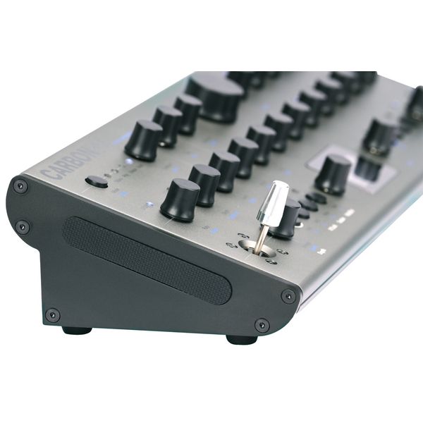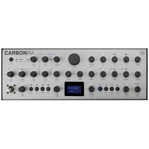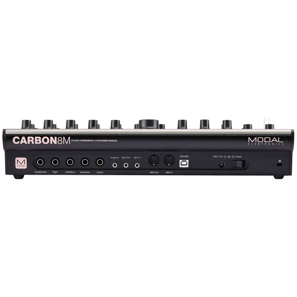 Modal Carbon8M — настольный восьмиголосный синтезатор с металлическим корпусом из стали и алюминия, построенный на новой цифровой архитектуре, более продвинутой, чем у серий ARGON8 и COBALT8. Основой служат два независимых цифровых осциллятора, каждый из которых работает на 56-ядерной структуре и использует расширенный набор методов генерации звука: 18 алгоритмических моделей и 38 вейвтейблов. Их объединяет система XCore-модификаторов — Phase Distortion, Wavefolding, Waveshaping — позволяющая динамически менять спектр, создавая многослойные и подвижные тембры. Внутренний модуль фильтрации включает 34 типа фильтров — от характерных моделей, вдохновлённых классическими аналоговыми схемами, до современных вариаций Modal с возможностью морфинга и насыщения. Система модуляции в Carbon8M строится вокруг трех LFO, трех независимых ADSR-огибающих, гибкой матрицы назначения, X/Y-джойстика, который может быть «зафиксирован» в нужной позиции. Секвенсор с четырьмя дорожками для автоматизации параметров поддерживает как запись в реальном времени, так и полифонический пошаговый ввод. Встроенный арпеджиатор на 32 шага имеет возможность создания пауз, инверсий, имеет расширенный набор алгоритмов проигрывания. Carbon8M можно использовать как настольный инструмент или интегрировать в 19″ стойку через кронштейны. Через MODALapp обеспечивается полный доступ к программированию и управлению патчами на компьютере, планшете и внутри DAW.