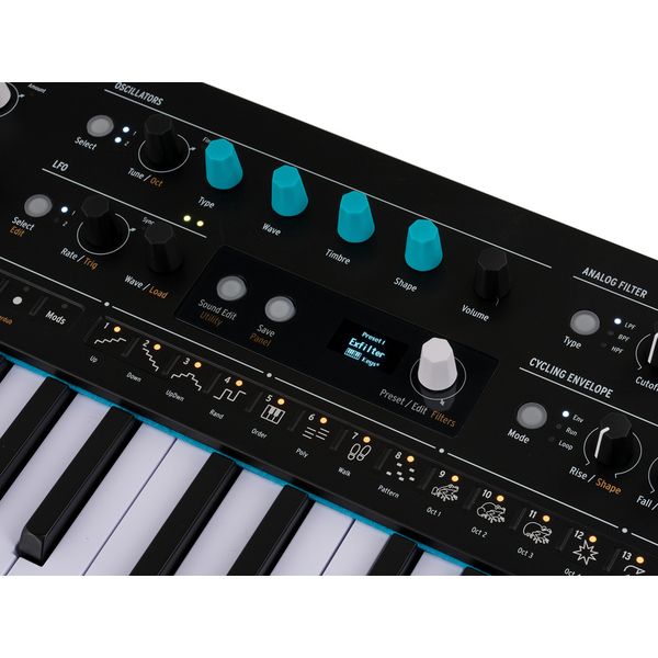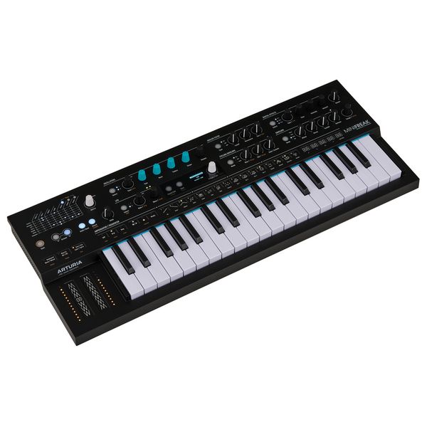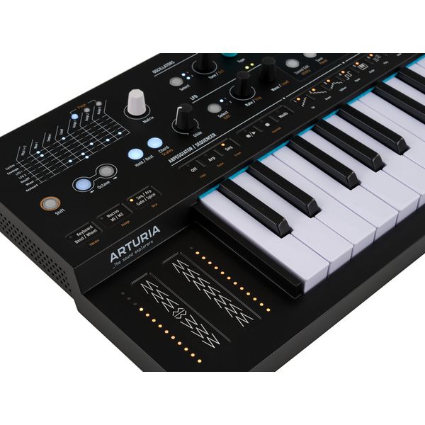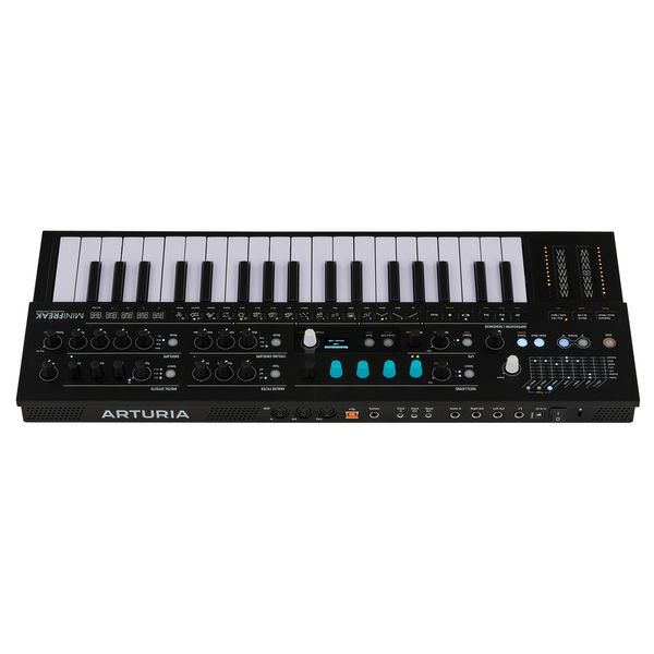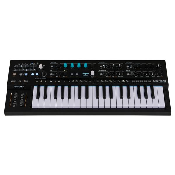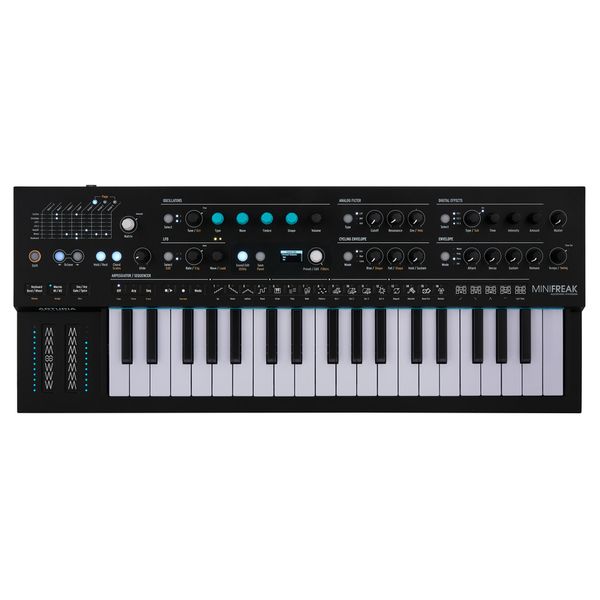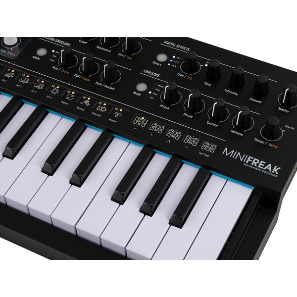 Arturia MiniFreak Thomann Edition — лимитированная версия полифонического цифрового синтезатора с двумя независимыми звуковыми движками на голос, ориентированного на гибридный звуковой дизайн и широкие возможности модуляции. Конструкция включает 37 узких клавиш с velocity и aftertouch. Для синтеза предусмотрены 30 режимов генерации тона. Каждый голос дополнен набором модуляторов: ADSR-огибающая, Envelope/LFO, два независимых LFO и аналоговый многорежимный фильтр с низкочастотным, полосовым и высокочастотными режимами. Матрица модуляции со семью источниками и тринадцатью назначениями позволяет формировать разветвленные схемы управления параметрами. Три слота эффектов (Insert или Send) обеспечивают обработку сигналов десятью типами эффектов. Для создания мелодий предусмотрены арпеджиатор с функцией ratcheting и случайными режимами проигрывания, а также пошаговый секвенсор на 64 шага. Панель управления включает OLED-дисплей и 40 физических органов управления для прямого доступа к параметрам. Память рассчитана на хранение 320 заводских тембров и 256 пользовательских. Версия Thomann Edition дополнительно включает программное обеспечение Arturia Chorus JUN-6 и MiniFreak V.
