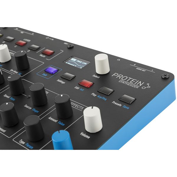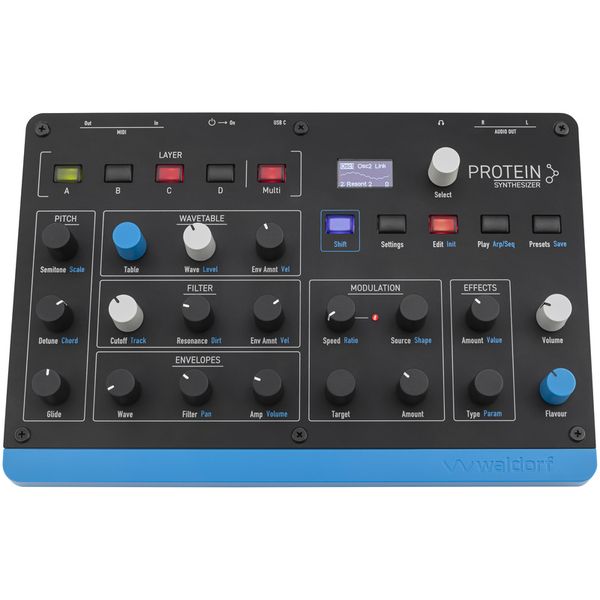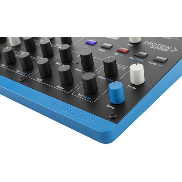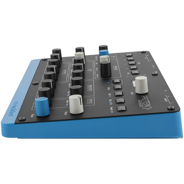 Waldorf Protein — компактный цифровой таблично-волновой синтезатор с 8-голосной полифонией и мультитембральностью (4 слоя), построенный на оригинальной архитектуре Microwave с использованием специализированного ASIC-модуля осцилляторов. Синтезатор оснащен двумя независимыми осцилляторами, которые воспроизводят все таблицы волн Microwave с точной эмуляцией 8-битного квантования. Обработка звука происходит через копию исторического CEM-фильтра. Синтезатор оснащен металлической передней панелью, арпеджиатором, 32-шаговым секвенсором, режимами фиксированного лада и игры аккордами, функцией наложения пресетов и двухслотовой DSP-платформу эффектов, а также поддерживает Poly-Aftertouch. Управление модуляцией сигнала реализовано через трехконтурные огибающие, два LFO с поддержкой синхронизации по темпу и режимом S&H, а также матрицу модуляции на 8 маршрутов. Предусмотрено хранилище на 250 пользовательских пресетов и более 100 заводских установок. Подключения включают пару линейных аналоговых выходов, стереовыход на наушники, интерфейсы MIDI In/Out (mini-TRS Type A) и USB-C для питания и MIDI-коммуникации.