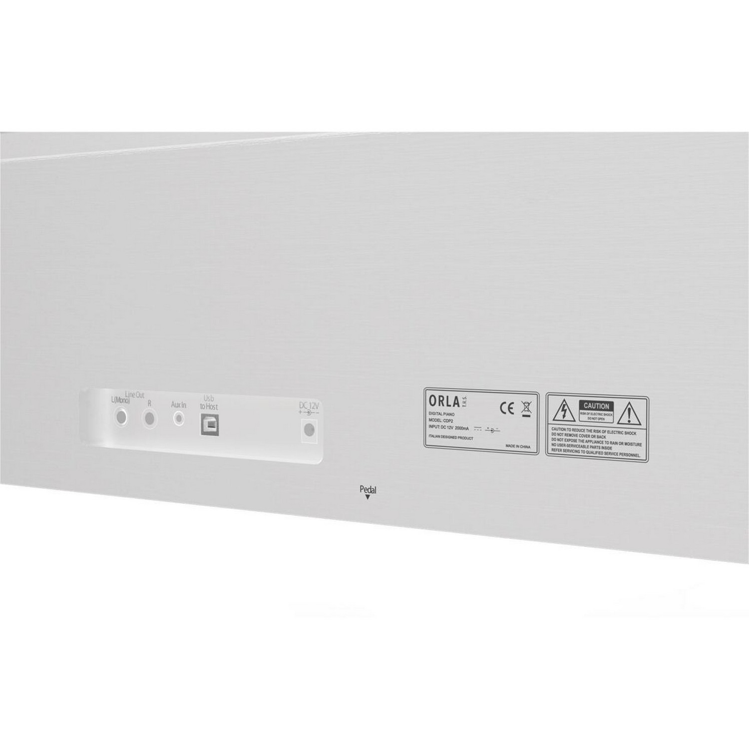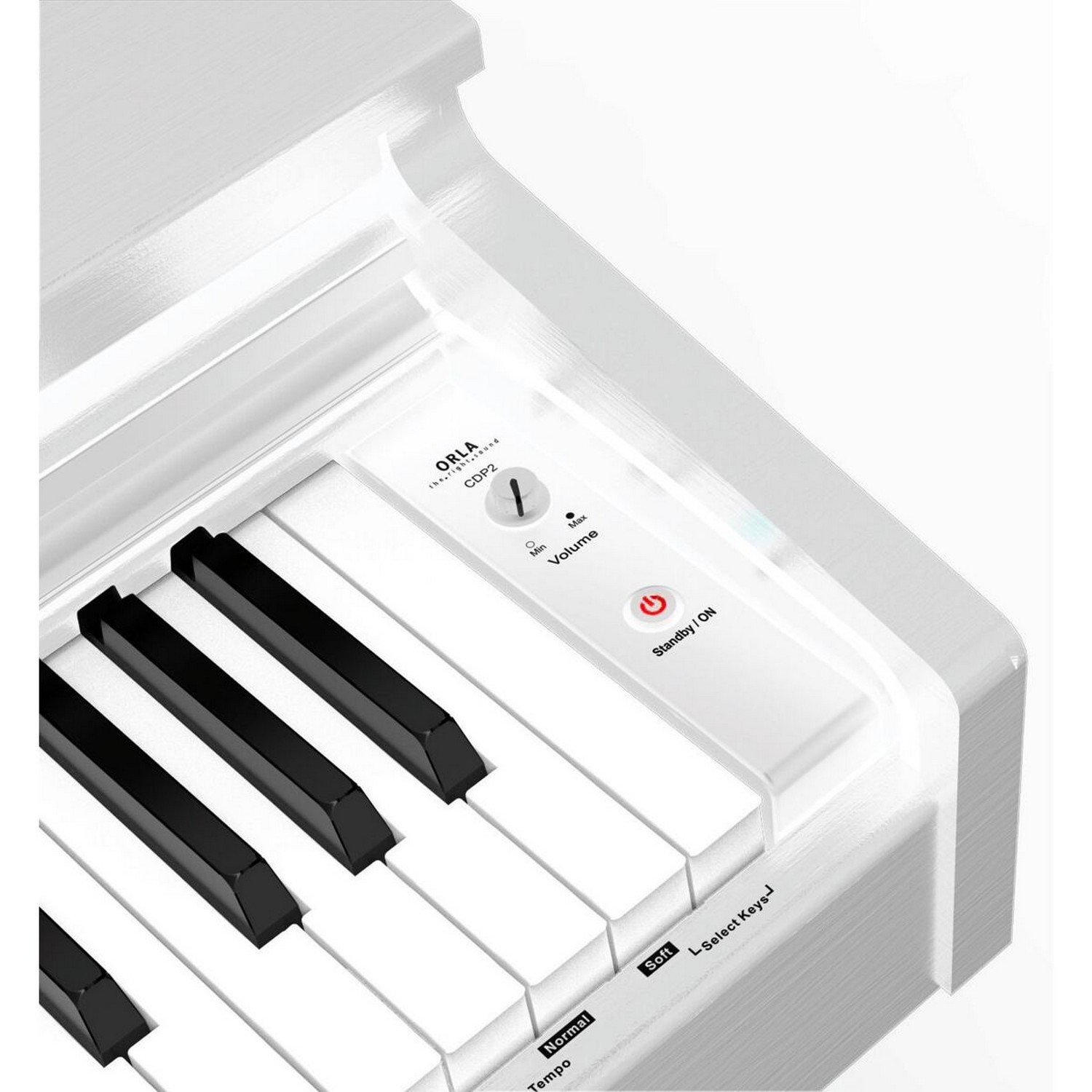 Orla CDP-2-Satin-White — цифровое пианино, оснащено полноразмерной клавиатурой на 88 клавиш с градуированной молоточковой механикой, обеспечивающей динамическую чувствительность и отклик, близкий к акустическому фортепиано. Система чувствительности к силе нажатия имеет три уровня регулировки и режим отключения, что позволяет адаптировать инструмент под индивидуальную технику исполнителя. Звуковой движок включает основной фортепианный тембр, а также расширенный набор встроенных голосов и тембров стандарта GM. Инструмент поддерживает функции обучения и практики — метроном с несколькими размерами, запись исполнения, транспонирование и тонкую подстройку высоты тона. Встроенный усилитель мощностью 2 х 10 Вт обеспечивает автономную работу без внешней акустики, а Bluetooth Audio/MIDI позволяет интегрировать пианино с обучающими приложениями и внешними устройствами.