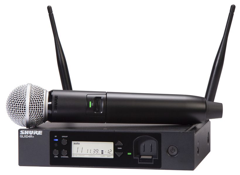 Shure GLXD24R+/SM58 — беспроводная вокальная система с двойным диапазоном частот 2,4 ГГц и 5,8 ГГц, включающая передатчик GLXD2+ с микрофоном SM58 и 9,5" рэковый приёмник GLXD4R+. Модель поддерживает до 8 одновременных систем (до 16 с Frequency Manager) и обеспечивает автоматическую настройку частоты. SM58 — динамический вокальный микрофон с кардиоидной диаграммой направленности и частотным диапазоном 50–15 000 Гц. Система оснащена LC-дисплеем, индикацией заряда батареи в часах и минутах, интегрированным слотом для зарядки аккумулятора и литий-ионной батареей с временем работы до 12 часов. Радиус действия системы — до 60 метров. Приёмник выполнен из пластика. В комплекте поставляются аккумулятор Shure, зарядное устройство и кейс EVA.